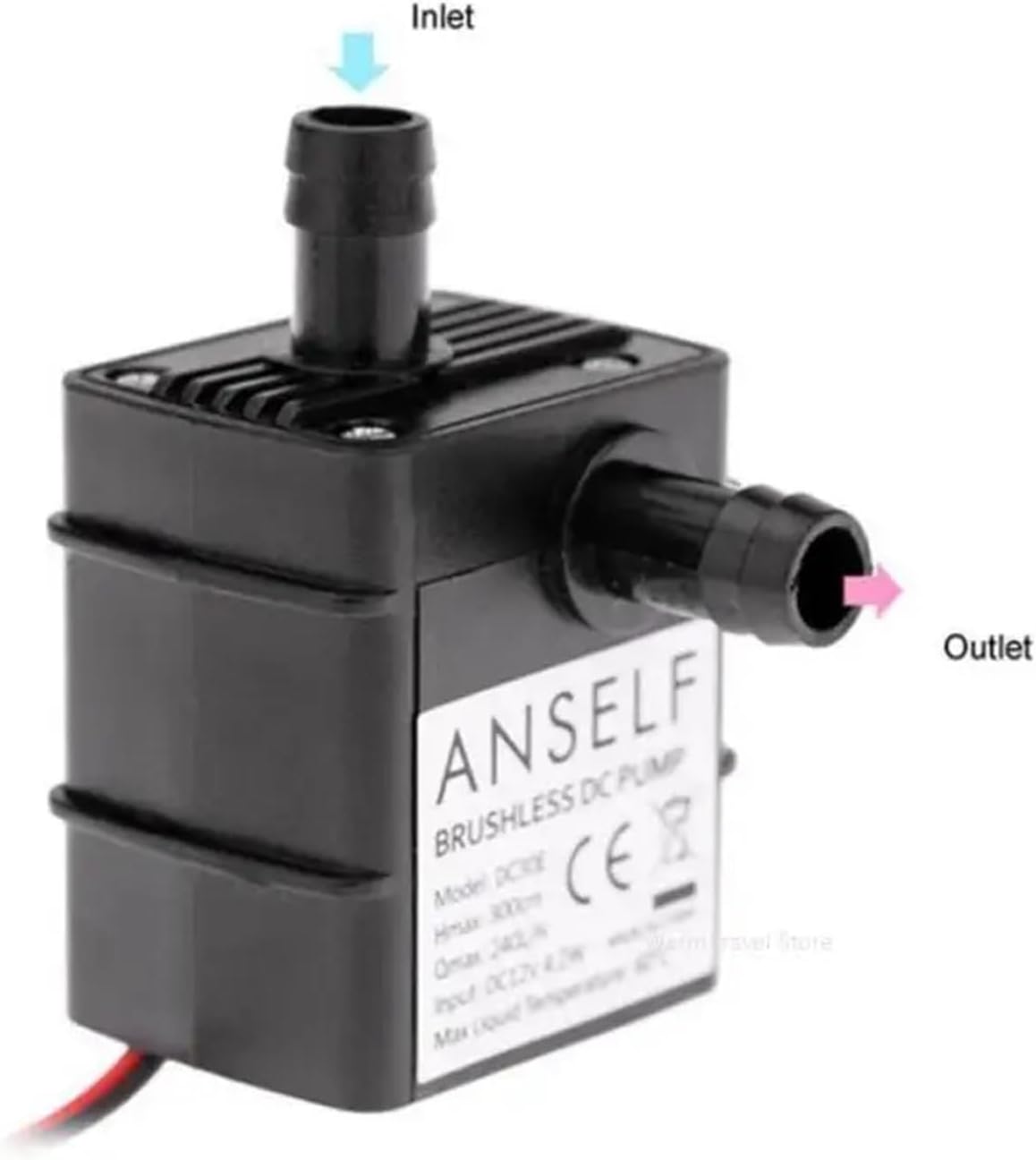 Pumps==========Application : SubmersibleTheory : Ceramic pumpStructure : Garden PumpStandard or Nonstandard : StandardUsage : WaterFuel : ElectricCertification : NonePower (W) : ElectricFuel : OtherPressure : OtherModel Number : Water PumpSize : 55(L) x 34(w) x 41(H) mmWeight : 65gPower consumption : 4.8WFlow rate : 240L/HLife span : 30000 hoursRated current : 400mARated voltage : 12V DCInlet : 8mmOutlet : 8mmPower Brushless DC Micro Pumps Membrane Submersible Fountain Aquarium Pumps