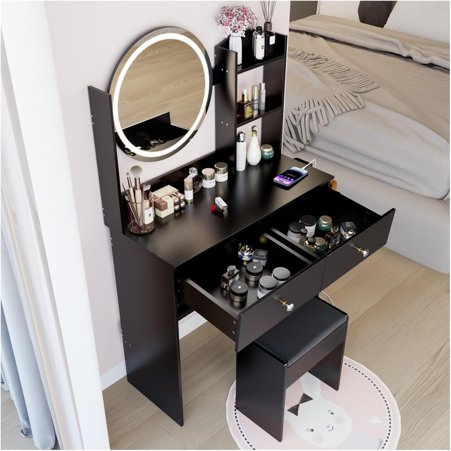 Main Color:Black/WhiteMain Material:MDFProduct Style:American DesignConfiguration:Luxury (mirror light+built-in socket+drier stand)Product DimensionsAssembled Length (in.):31.50Assembled Width (in.):14.20Assembled Height (in.):46.50Product Weight (lbs.):40.00