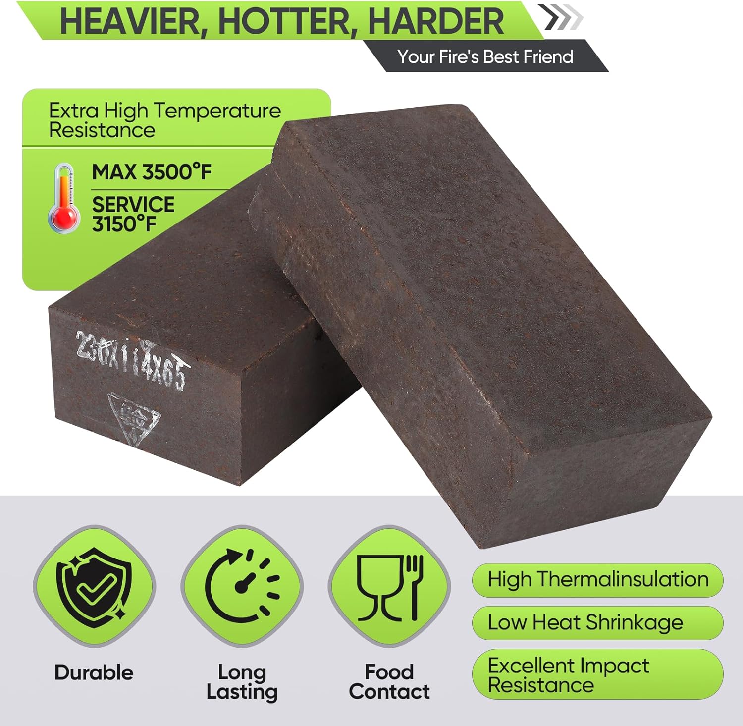 Magnesia chrome brick Widely applied in:Magnesia chrome brick are widely used in various high-temperature industrial fields, such as the iron and steel industry, non-ferrous metals industry, and building materials industry. In the iron and steel industry:Magnesia chrome brick are primarily used for the linings of equipment like blast furnaces, hot blast stoves, converters, and electric arc furnaces.In the non-ferrous metals industry:they are used for the linings of equipment such as reverberatory furnaces and resistance furnaces.In the ceramics industry:they are used for the linings of equipment such as ceramic firing kilns and high-temperature tunnel kilns.the building materials industry:Magnesia chrome brick are also applied in equipment like cement kilns and glass furnaces. Why Choose Our Firebricks? 30% Faster Heat-Up: Specialized additives enhance thermal conductivity, slashing preheating time and saving up to 30% fuel compared to basic chamotte bricks. Industrial-Grade Strength, Home-Friendly Safety Withstands 3600°F (1980°C) – ideal for fireplaces, ceramickilns, and BBQ pits. for molten metal applications.Cut-to-Fit Simplicity:Easily shape bricks with standard tools (angle grinders/masonry saws) to line curved surfaces.Multi-Layer Protection:Use as hearth foundations or interior furnace linings to reduce heat loss by 35% and shield appliances from thermal stress. Perfect for These Projects:Pizza Ovens: Achieve crispy, evenly cooked crusts with rapid heat distribution.Wood Stoves/Fireplaces: Extend lifespan by protecting metal interiors from corrosion.Blacksmith Forges: Build a hobbyist-friendly hearth that resists cracking. Ceramic Kilns & BBQ Complexes: Maintain stable temps for smoking or pottery. What’s Included & Specifications:2-Pack Firebricks per box (9" x 4.5" x 2.5")Weight: 11.24 lbs/brickColor: BlackMaterial: Magnesia + Chromium + Clay (as binder)Max Temp: 3600°F (1980°C)Thermal Conductivity: 1.8W/m·K Pro Installation Tips:Mortar Matters: Use fireclay or alumina mortar (sold separately) – cement mixes crack under high heat! Prep Surfaces: Lightly dampen bricks before applying mortar for stronger bonds.Cut Smart: Watch our video tutorial (link in FAQ) to avoid chipping edges.Safety First: Wear gloves and goggles during cutting/installation.
