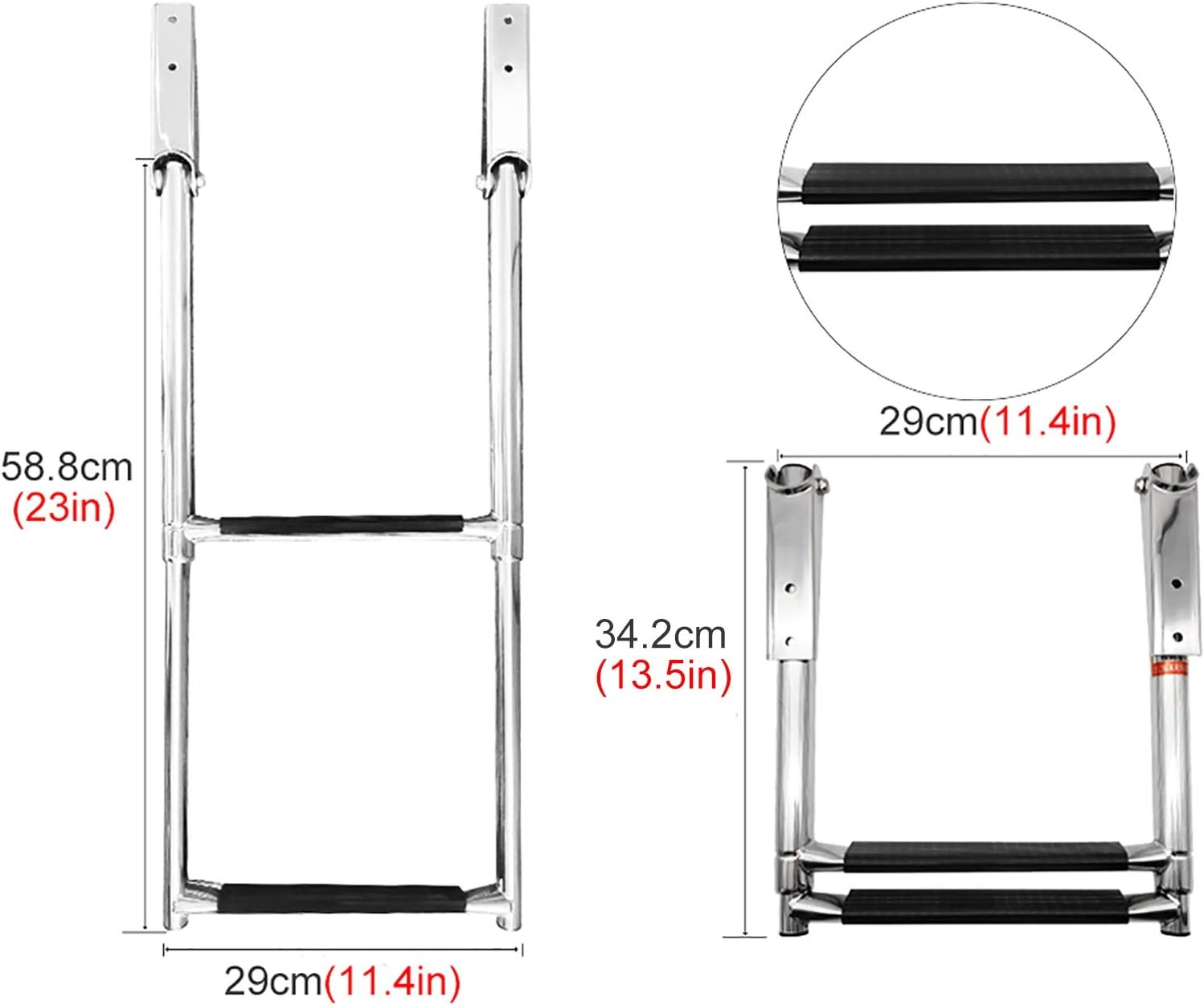 Product DescriptionSleekly designed and manufactured from a high-grade stainless steel, this marine product has been designed to last in the harsh marine conditions. This telescopic boat ladder is made to be bolted to a horizontal platform such a the boat floor or side railings depending on the installation.SpecificationMaterial: Premium 316 stainless steel Finish: PolishedLadder Length (extended): 23"(58.8cm)Length Stowed: 13.5"(34.2cm)Overall Ladder Width : 11.4"(29cm)Max Load: 150kg/330lbsFeaturesHeavy duty all welded 316 stainless steel pontoon ladder.2 wide steps that telescope for a nice clean look.Easily mounts to deck Flips up .The folding steps drop smoothly and quickly into the water to provide convenient boarding.Package Includes1 × Boat Ladder (Installation accessories)NoticePlease allow 1-2cm difference due to manual measurement.The color of the actual items may slightly different from the listing images due to different computer screen.If you like our products and services check out our store for different sizes and models ladders.