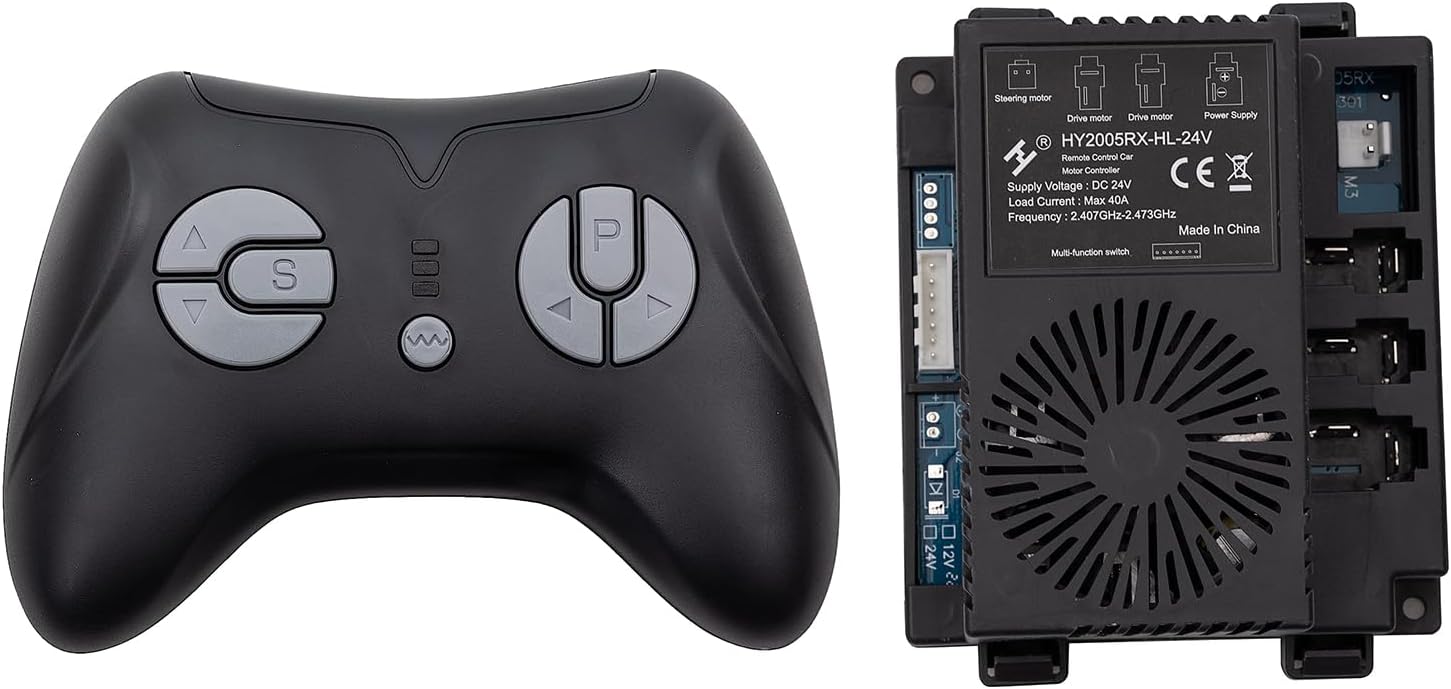 Product description How to make sure whether the control box fits your car? Open your broken electric ride on car and check the control box. If the appearance of the control box is the same, this part should fit your car. Specifications: - Model Number: JR1922RXS-D2 - Voltage: 12V - Control Method: 2.4G Bluetooth Package Content: 1 pcs Control Box 1 pcs remote control 2 4G Remote Control Instructions Step 1: The Remote Controller is loaded with two AAA btteries. Step 2: Tum off the power switch on the vehicle. Step3: Hold downn ^▲“&“▼“keys for 3 scconds start match code, The fist LED flicker.Now turm on the vhicle power switch The red indicator lights stop fashing, and the code is successful. Keys caption : "S”set up speed, 1 led lit up is low speed, 2 leds lit up is medium speed, 3 leds it up is high speed, “▲"Forward, “▼"Back, “◀"Left, “▶”Right, Press P”key hold the brake, All LED flicker WARNING! Not for children under 3 years. Small parts. Choking hazard -Load two AAA ( 1.5V ) batteries according to the diagram. -Non-rechargeable batteries are not to be recharged. -Different types of batteries or new and used batteries are not to be mixed. -Batteries are to be inserted with the correct polarity. -Exhausted batteries are to be removed from the toy. -The supply terminals are not to be short-circuited. -The packaging must be retained since it contains important information.
