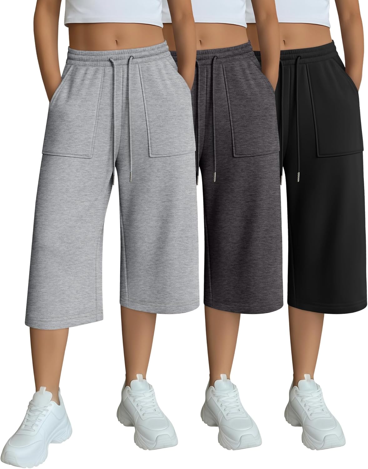 Features: These capri yoga pants with pockets are designed to fit a variety of leg shapes and have a wide-leg design that allows for movement without being restrictive. Our women's summer loose fit capris combine functionality with style. Two side pockets hold essentials like keys, phone, and wallet. Specifications: Material: 75% Polyester, 25% Cotton Package includes: 3 x Women's capri pants Notes: Manual measurement, please allow slight errors on size. The color may exist a slight difference due to different screen displays