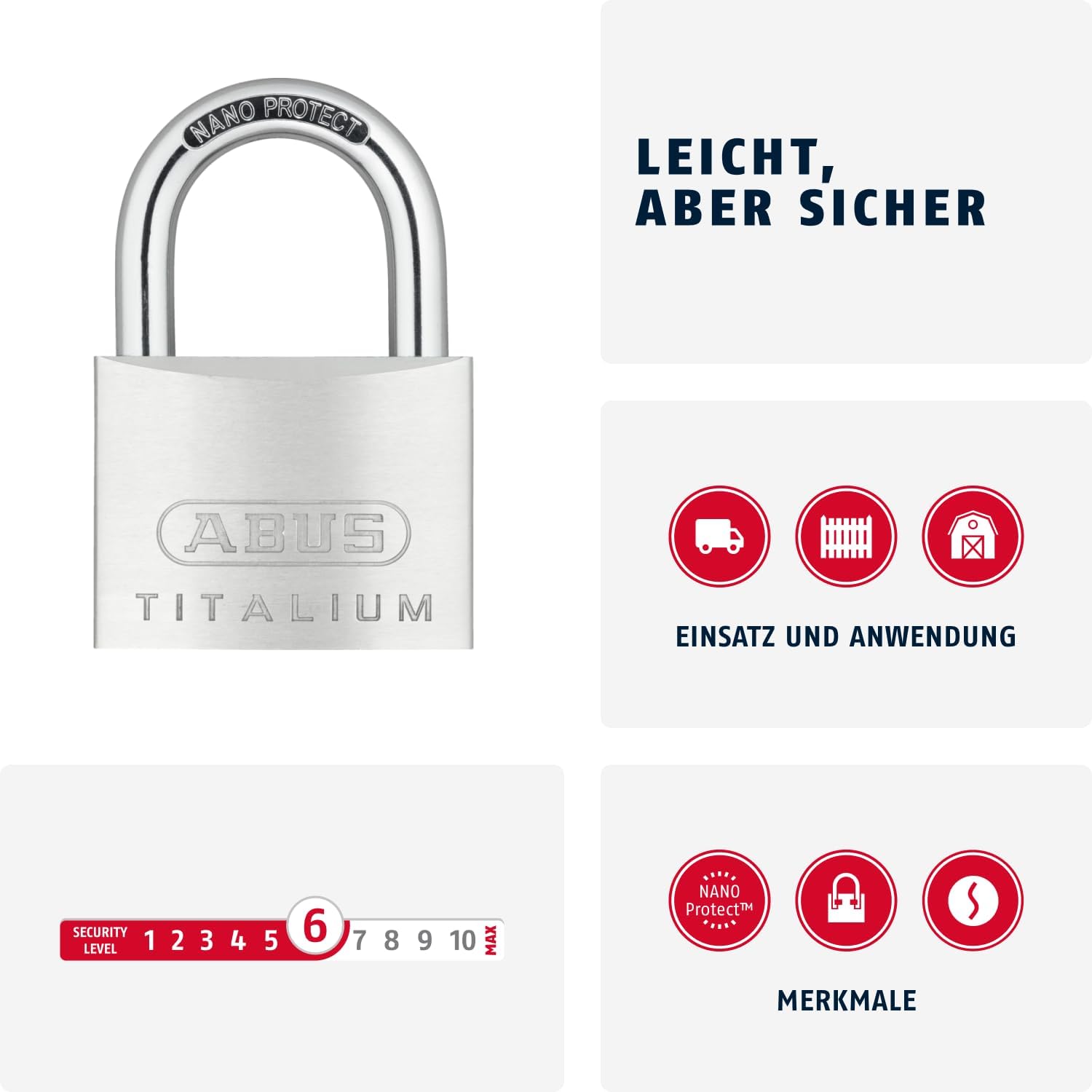 Product Description Product description ABUS Titalium padlock 64TI/60 With this compact lock, you can lock chains, doors, toolboxes, lockers, cellar doors and countless other objects reliably and easily. This is ensured by the solid lock body made of extra-light special aluminium and the hardened steel shackle. Thanks to its low weight, the lock is particularly easy to handle and uncomplicated to use. The special key profile and double shackle locking make picking and tampering very difficult. Padlocks from ABUS - always the right solution ABUS offers a wide range of padlocks for every type of property. A large selection of colours, various locking mechanisms and different materials ensure that everyone can find the right padlock. Whether gates, doors or bags, the locks reliably secure your property. Further product benefits: ➦ Tulip-shaped key head ➦ Low weight ➦ Incl. 2 keys Brand description ABUS - innovative security solutions since 1924 The history of ABUS is the history of a company that has been dedicated to a single mission from the very beginning: To make people's lives safer - at home and when travelling. What once began with the production of padlocks in the company's own forge has become a globally active company with leading expertise in the field of security. Customer-centred, innovative and reliable, we meet security needs and have been inspiring people with our products for generations. Set Contains: 1 x ABU64TI60 64ti/60 Titalium Padlock 60mm
