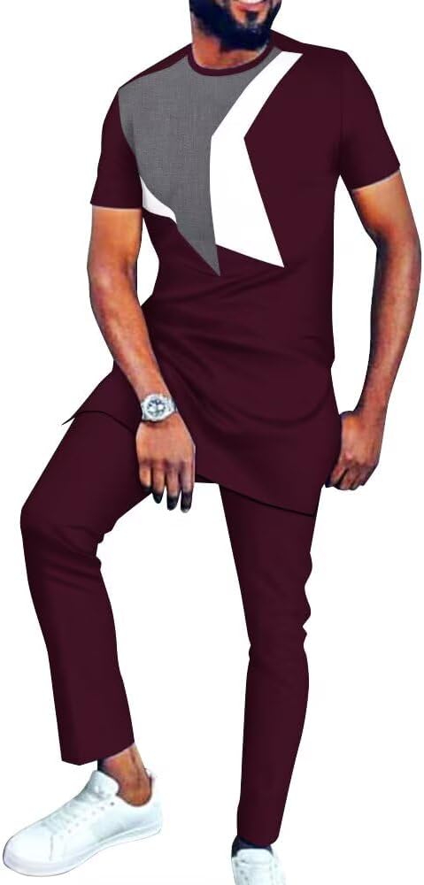 Description:Item Type 1:African clothes for menItem Type 2:Dashiki men suitsItem Type 3:Agbada robe suitsDecoration:PatchworkCollar:O-neckSleeve style:ShortClosure:ButtonSilhouette:SlimOccassion:Office,DailyStyle:CasualContent:2 pieces setElasticity:nonerThe clothes provide personal customization:Please providing measurement size and make the clothes according to the size