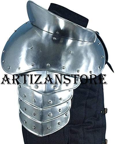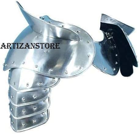 This Warrior Pauldrons have an addition of large swordbreakers which not only serve a functional purpose but create a very intimidating look. They are crafted from 18 gauge steel. The Warrior armour features a simple row of studs along the edges, this armour fits just about any period for any character. The Warrior Pauldrons have a large shoulder plate and four smaller lames that protect the upper arm.