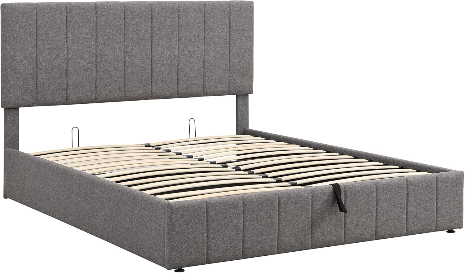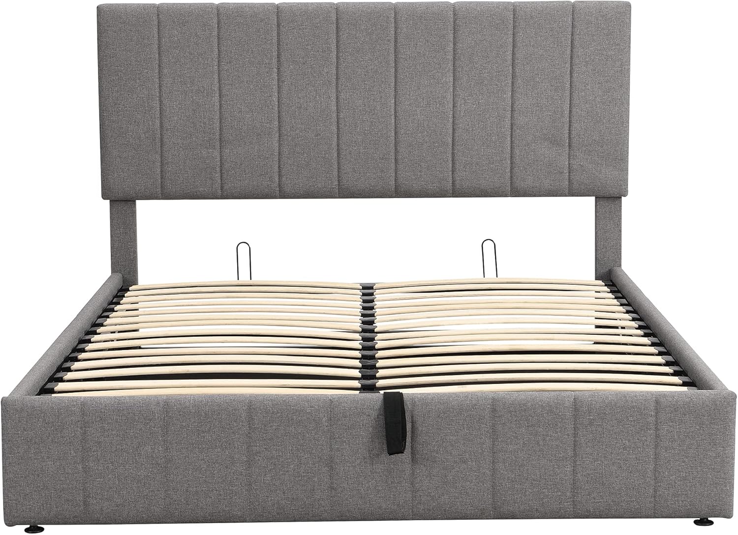 This beautiful Upholstered Platform Bed features upholstered headboard that adds a contemporary chic look to your bedroom and filled in thick foam to add extra comfort. Sturdy wood frame construction and a wooden slat system to add extra stability and safety. A hydraulic storage system underneath the mattress makes storing your bedroom things in smaller spaces possible without compromising the size of bed you want. What’s more, this product arrives with a slat kit, do not miss the chance take it home today.Weight & DimensionsOverall Product Dimension:83 x 64.7 x (44.6 or 48.6) inchesHDetail Product Dimension:Please refer to the Size imageNumber of Package:2 Package Dimension:Package 1: 83.07 * 13.19 * 4.72 inches 40.12 lbsPackage 2: 67.32 * 26.18 * 4.13 inches 63.27 lbsOverall Product Weight:96 LBSWeight Capacity:500LBSRecommended Mattress Thickness:8 SpecificationsProduct Type:Upholstered BedSize:QueenColor:Beige GreyProduct material:Plywood+Pine Wood+LinenBed slat material:PlywoodLevel of Assembly:Partial assemblyBox Spring Required:NoMattress Included :NoEstimated Time to Assemble:40 minsWarranty time:One Year(Manufacture Defect)Suggested Number of People:2Additional Tools Required : All Tools IncludedAvoid power tools:Yes Number of Slats:24Country of Origin:ChinaNotes1.Manual measurement has been used,there may be some reasonable error.2.All the pictures are taken by actual samples, slight chromatic aberration may occur due to lighting or display.