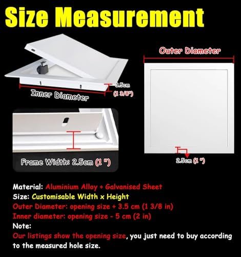 Our plasterboard access panels are the perfect blend of functionality and style, offering an ideal solution for accessing interior spaces for maintenance and service. Crafted from durable aluminum alloy, these access panels are customizable to fit a variety of needs, making them an essential addition to your home or office. **Specifications**: - **Frame Material**: Aluminum Alloy - **Customizable Sizes**: Width: 10 - 45 cm (4 - 17.7 in); Height: 10 - 50 cm (4 - 19.6 in) - **Installation Thickness**: 3.3 cm (1 1/4 in) - **Frame Thickness**: 4 mm (1/8 in) **Key Features**: - Excellent sealing properties ensure a secure fit. - Quick and easy installation process. - Utilizes seamless welding technology for enhanced durability. - Designed for effortless opening and closing. - Offers good fire resistance for added safety. - Custom sizes available to accommodate various applications. - Seamlessly integrates with your interior décor. - Ideal for covering HVAC systems, pipes, electrical wiring, and attic passages. - Versatile enough for use as barbecue access doors, meter box doors, well access hatches, and loft doors. **Package Information**: - Includes one access panel and screws for installation. **Important Reminder**: Please provide the exact dimensions of your opening when placing your order. Due to manual measurement, slight deviations may occur. Product images may vary slightly due to different photographic equipment; please refer to the actual product. **Customer Satisfaction**: We are committed to providing you with the best service possible. If you have any questions or need assistance, please feel free to reach out to us. Our goal is to ensure your complete satisfaction with our access panels.