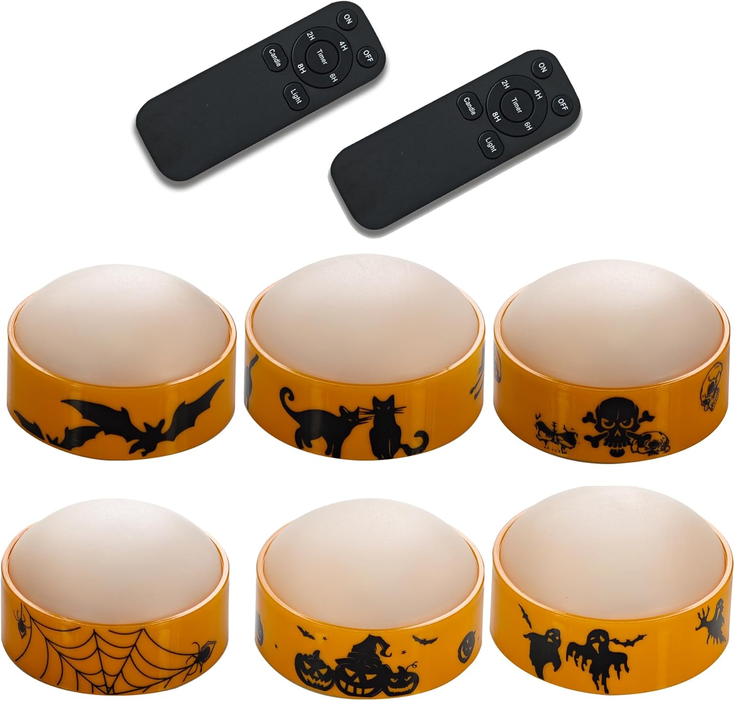These LED pumpkin lights are specially designed for your Halloween pumpkin decorations. By using a remote control, you can turn them on and off or change settings from up to 20 feet away. They are flameless and will never burn your pumpkins. They are battery-operated and will never be blown out by wind. Compared to the real wax candles, these plastic battery operated LED candles lights are safe to use with, especially when you have children and pets at home. Specifications 1. Material: Plastic 2. Shape: Round doom 3. Size: 2.6" in diameter, 1.5" in height 4. Color: Orange 5. Light color: Warm white 6. Battery required: Each pumpkin light requires 2 AA batteries (not included). The remote control requires 2 AAA batteries (not included).