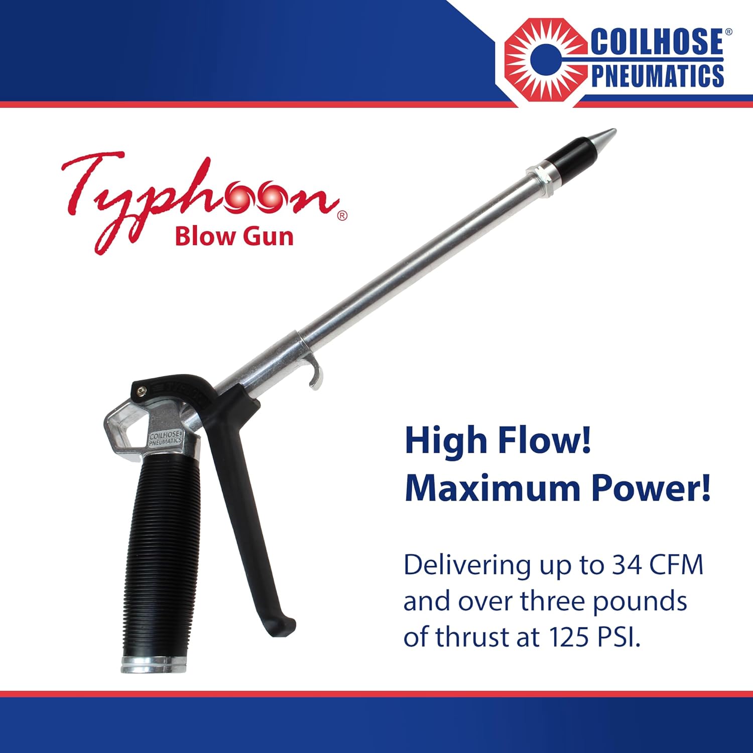 The Typhoon delivers 34 cfm and more than 2 pounds of thrust (working capacity) at 125 psi. The variable flow trigger allows for controlled output, making the Typhoon ideal for heavy duty clean-up and blow-off. Its light weight and sleek design make this blow gun a favorite of users in many industries.