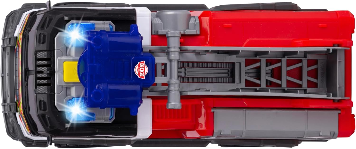 Action-packed rescue missions. With the interactive toy car "Fire Rescue Unit" from Dickie Toys every fire brigade mission becomes a real adventure! The freewheel allows for effortless rolling and pushing of the car, while moving parts such as the fold-out ladder and a hinged side compartment stimulate children's imagination and creativity. But the absolute highlight of the rescue vehicle is the launch mechanism, which is located at the top of the ladder: the included discs - with cool engravings of water and a drone - are inserted into the blue device and fired by lever! So the kids can extinguish imaginary fires with the emergency vehicle or monitor their rescue operations from the air. Great fun for small firefighters aged 3 and up. Three realistic sounds - engine start, driving sounds and an impressive siren - make the use of the little firefighters and firefighters come alive. The bright blue light signals: help is on the move! The robust, 30 cm long fire engine is suitable for girls and boys from 3 years and is immediately ready to go thanks to the included batteries. Whether indoors or outdoors, the Dickie Toys fire brigade toy is always ready for your next adventure! A quality toy from Dickie Toys As a company with over 50 years of industry experience, we know how to inspire children of different ages and encourage them to play. Even the smallest ones start to discover and test the numerous game functions very early. Dickie Toys trains motor skills and also takes the first steps towards traffic education. Whether in the children's room or outdoors, with Dickie Toys the fun is absolutely guaranteed.
