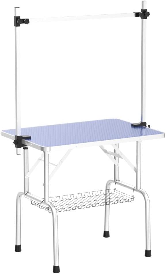 36 INCH DOG GROOMING TABLE Help Pet Groomers to Save More! Whether you are a professional groomer or an occasional one, grooming your dog right at your home, a dog grooming table is a must-have equipment. DIY your own grooming salon and save money in pockets just starting from the basic activities like hair cutting or nail trimming to serious grooming tasks. Your task becomes much easier, convenient and obviously, faster. Additionally, your dog remains steady and safe so you don't have to worry. Back Saver& H-type Adjustable Grooming Table Arm - Designed with movable and 38’’ tall adjustable firm grooming arm and 2 noose to better fit for various pets of different sizes. One could simply use the clamp and security Loop to keep them in position for an extended grooming session. The perfect height of this table, makes it a better back saver. 36'' Large Grooming Table - 36" x 24" x 30", suitable for all kinds of small, medium and large pets, like cats, rabbits, miniature, poodle, schnauzer, pomeranian, samoyed, papillon and all kinds of other puppies, even for larger breeds. Lightweight& Super Sturdy - The capped feet protects this dog table from slipping even on watering floor. High quality non-toxic board with exquisite stainless steel edges, durable stainless steel legs, makes it a firm, long lasting grooming table for dogs, strong steel frame holds up to 330 lbs.