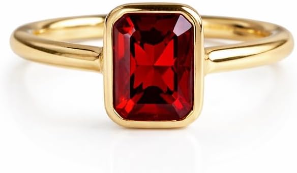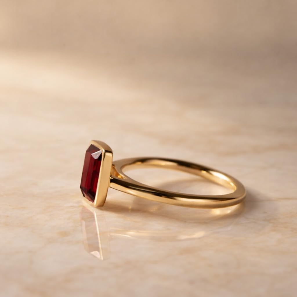This elegant Emerald Cut Red Garnet Ring showcases a striking deep-red garnet set in a modern bezel setting on a polished yellow gold band. The clean lines and minimalist design make it a timeless piece that blends classic gemstone beauty with contemporary style. Garnet symbolizes love, passion, and strength, making this ring an ideal choice for a promise ring, engagement ring, or meaningful gift. Its secure bezel setting and slim band ensure both comfort and durability, perfect for everyday elegance or special occasions. Handcrafted with attention to detail, this ring is a refined statement of love and sophistication—designed to be cherished for years to come.