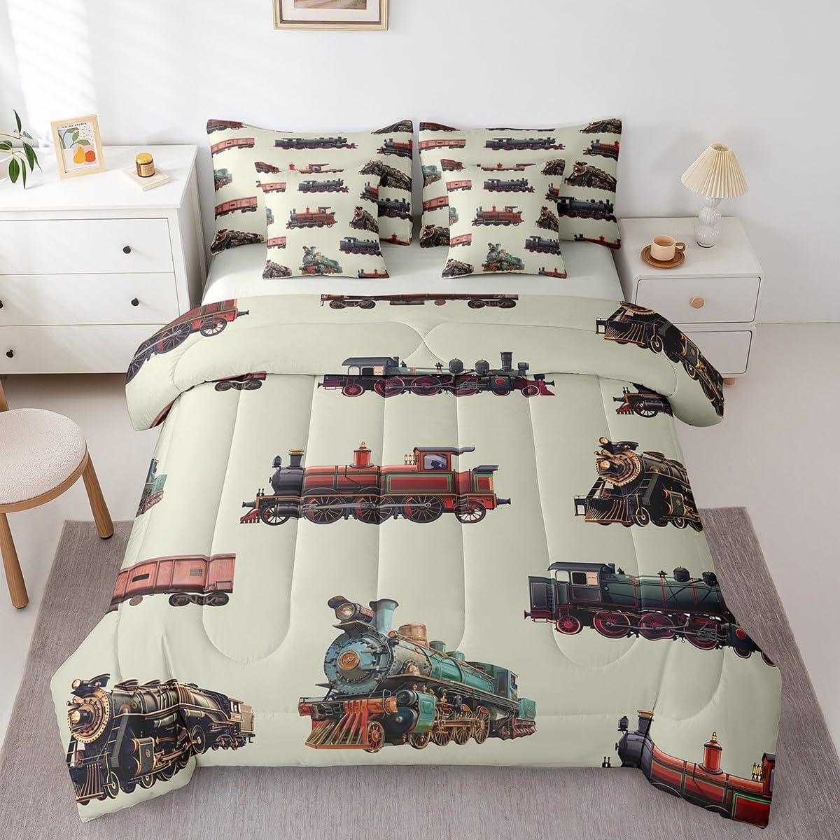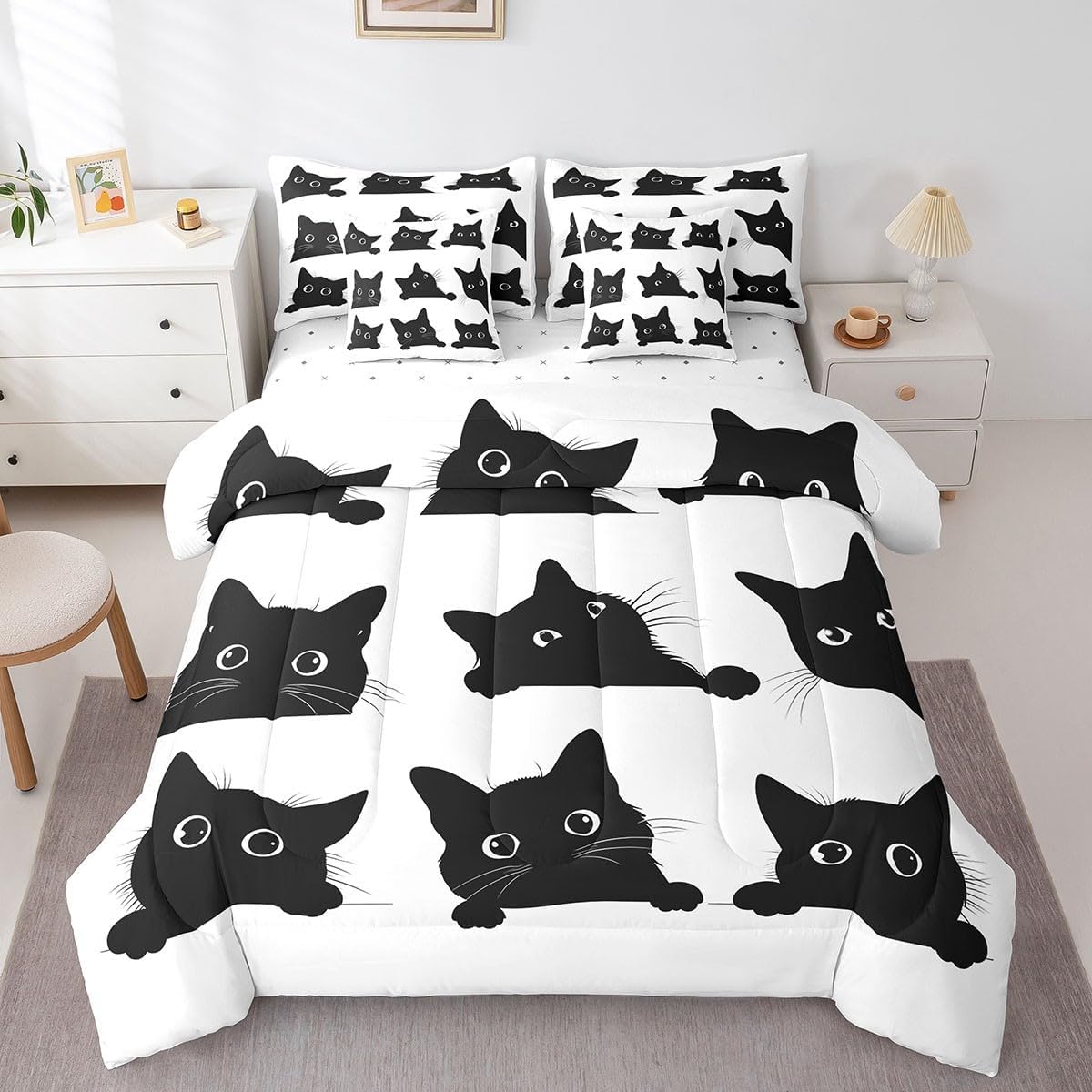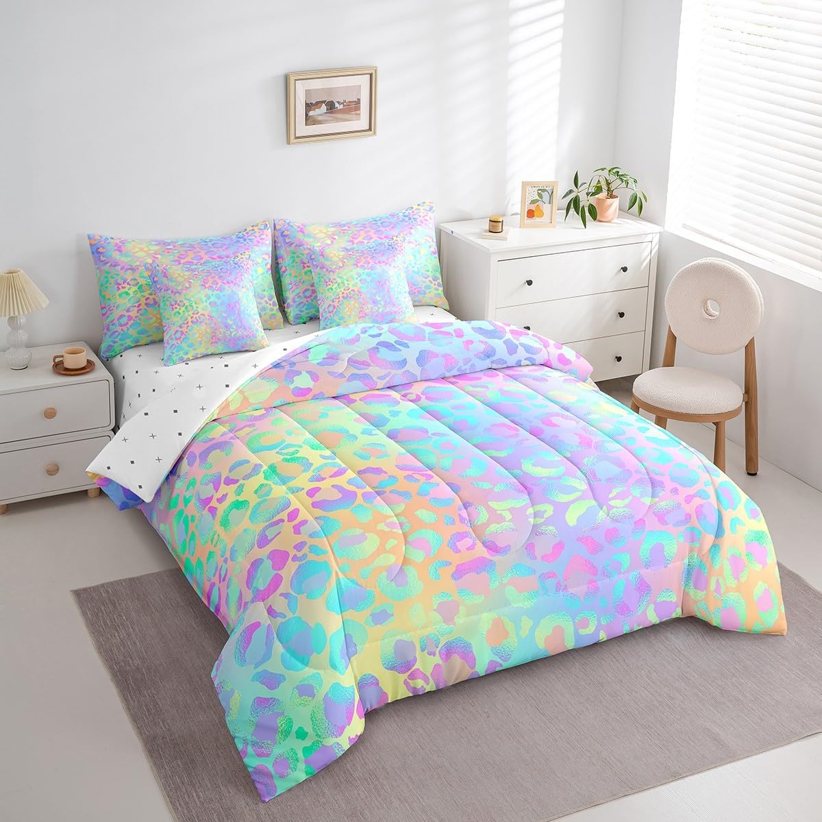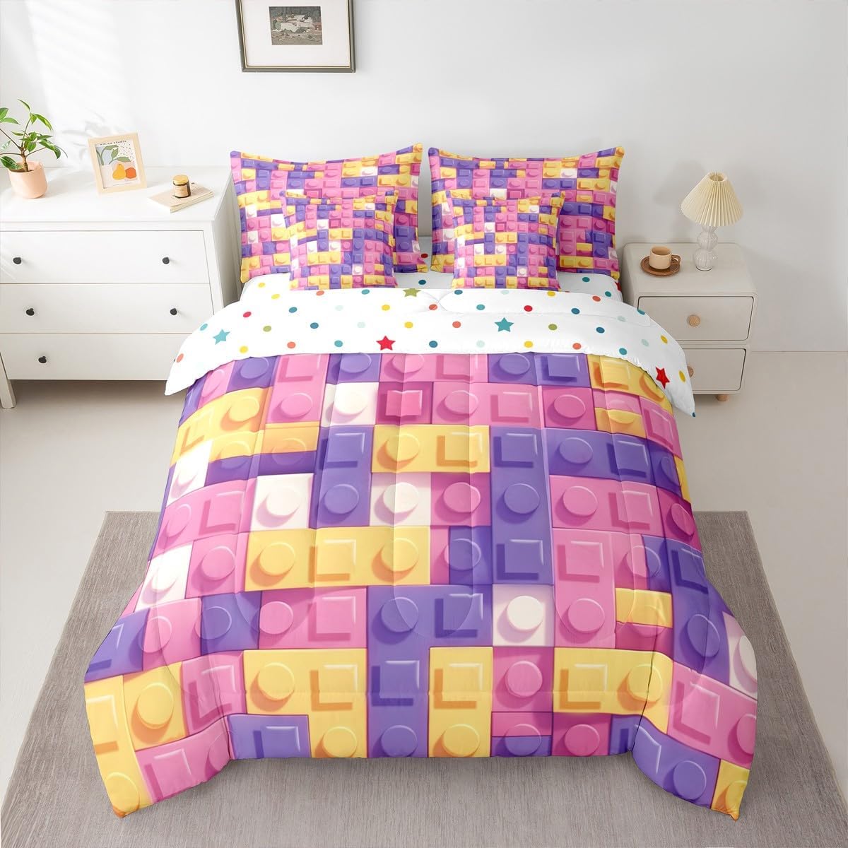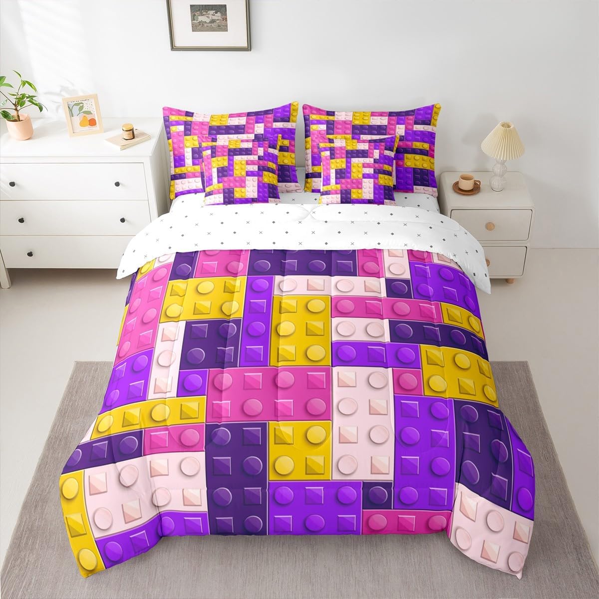 Why choose us Everyone has their own preferences; we develop different styles and different designs to suit the hobbies and aesthetics of different people; we look forward to bringing more joy and fun into your life; special design for special you; it's not just a simple home product, it's a way of life Brighten up your bedroom with this bed linen set; this bright and colourful bedding set features vibrant colours and special print pattern; turn the reversible duvet set over for a new look against a modern geometric background Convenient to use due to polyester which is super soft and comfortable; this all year round bedding is designed to be lightweight and breathable for a good night's sleep; a practical product for homes, dormitories, hotels, guest rooms Twin bedding set includes 1 twin comforter: 68"x90", 1 fitted sheet: 39"x75"x16", 1 flat sheet: 66"x96", 2 Pillowcases: 20"x30", 2 square pillow covers: 18"x18", perfect for a twin size bed. Full bedding set includes 1 full comforter: 79"x90", 1 fitted sheet: 54"x75"x16", 1 flat sheet: 81"x96", 2 Pillowcases: 20"x30", 2 square pillow covers: 18"x18", perfect for a full size bed. Queen bedding set includes 1 queen comforter: 90"x90", 1 fitted sheet: 60"x80"x16", 1 flat sheet: 90"x102", 2 Pillowcases: 20"x30", 2 square pillow covers: 18"x18", perfect for a queen size bed. King bedding set includes 1 king comforter: 104"x90", 1 fitted sheet: 78"x80"x16", 1 flat sheet: 90"x106", 2 Pillowcases: 20"x36", 2 square pillow covers: 18"x18", perfect for a king size bed. In addition to this comforter set with sheets, there are curtains, area rugs, shower curtains, blankets and other furniture with the same design waiting for you to explore. Whether it is for birthday of your family or friends, relatives, or just for yourself, the item should be interesting and authentic.