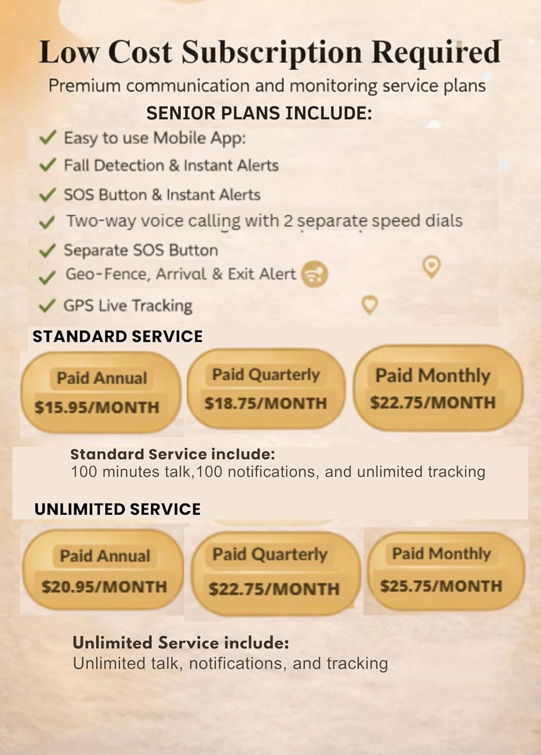 | Additional Features | Alert Notification/ Fall Notification, Geo-Fence, Location History, Mini-Phone,Two-way phone conversation, SOS/ LIFE TIME WARRANTY |