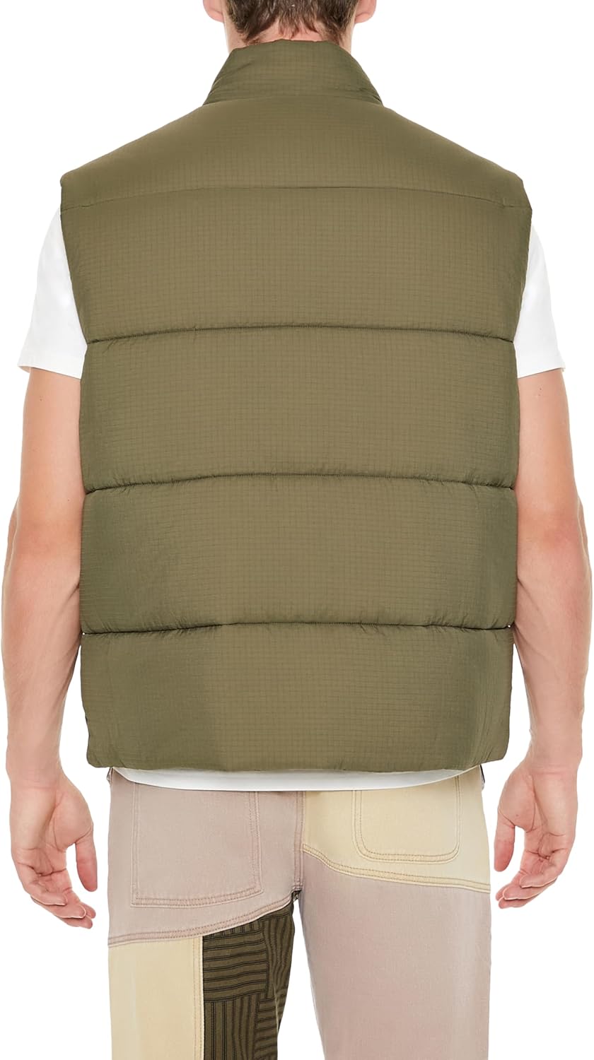 A woven utility vest featuring an allover channel-stitched construction, funnel neck, concealed zip-up and snap button-front closures, chest flap pockets, and slanted front pockets.