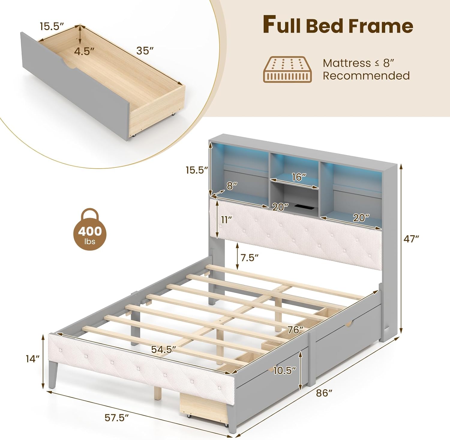 Description: Our full size bed frame features a padded bookcase headboard, perfect for reading and lounging, and comes complete with 4 convenient storage cubes for your books, magazines and essentials. Plus, 2 drawers under the platform bed provide ample storage space for your clothes and blankets. Stay connected with the built-in charging station and set the mood with ambient LED lights with multiple modes and colors, all remotely controlled without the need of fumbling for the switch. Its sturdy design with 8 wide slats keeps your mattress perfectly in place for a sound night's sleep. Revamp your bedroom with our modern full bed frame today! Features: 4 storage cubes for frequently used items Upholstered headboard for comfy reclines Built-in charging station for your electronic devices Customizable ambiance with RGB LED lights Adjustable speed, brightness and color via a remote 2 large drawers beneath bed to store your clothes Flexible drawer placement options to meet your needs Smooth drawer wheels for effortless accessibility Sturdy plywood bed slats for comfort and durability Embedded design keeps mattresses from slipping Recommended to use with full mattresses less than 8" thick No Box spring needed Specifications: Color: Gray Material: Pine Wood, MDF, Linen Fabric, Sponge, PB, Engineered Wood Overall Dimension: 86" x 57.5" x 47" (L x W x H) Inner Dimension of Drawers: 35" x 15.5" x 4.5" (L x W x H) Storage Height of Headboard: 15.5" Storage Depth of Headboard: 8" Width of Headboard Storage Cubes: 20"/16"/20" Recommended Mattress Thickness: ≤ 8" Weight Capacity of Bed: 400 lbs Weigh Capacity of Each Drawer: 55 lbs Floor Height: 10.5" Power Cord Length: 5 ft AC Outlets: 120V 12A USB & Type-C Ports: 5V 2.1A in Total Net Weight: 114.5 lbs Package Includes: 1 x Bed Frame 1 x User Guide