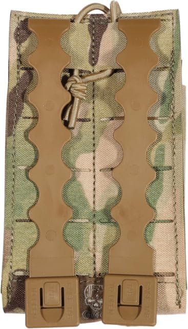 Our Single 7.62 Mag Pouch is constructed of laser cut laminate nylon, which means it's lighter and more streamlined than ever before! It will securely hold one twenty round 7.62x51 NATO(.308) mag. Ideal for SCAR Heavy, M-14, HK-91, FN FAL or most other 20 round 7.62 rifle magazines. Features an open top design with an adjustable bungee retention strap that allows for silent removal of your magazine and modular webbing on the front and back to allow for stacking other pouches. Attaches to any MOLLE/PALS style webbing with two included short MALICE CLIPS®. Available in MultiCam®, Coyote Brown and Black. Magazine not included.
