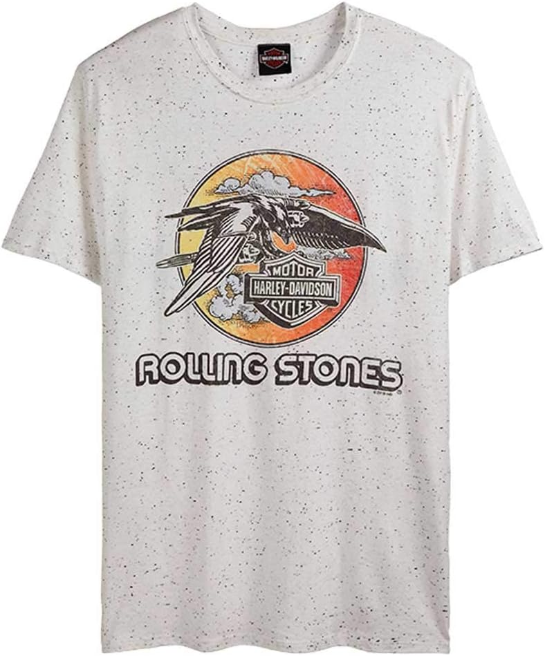 Harley-Davidson Men's Rolling Stones Jet Eagle Short Sleeve T-Shirt, 30298885. Off-white colored tee with a black fleck design, totally unique. If Rock N' Roll and Hogs are your thing, you are definitely going to dig this collection. Awesome mash-up of the iconic Jet Eagle cover graphic and a time-less Bar & Shield logo. Graphic features a distressed look. Classic style crew neck, traditional comfort fit. Extremely soft high-quality, made from 50% polyester, 38% cotton and 12% rayon. The Rolling Stones have teamed up with Harley-Davidson to release this special limited edition collection. A collaboration that brings two iconic brands together! 30298885