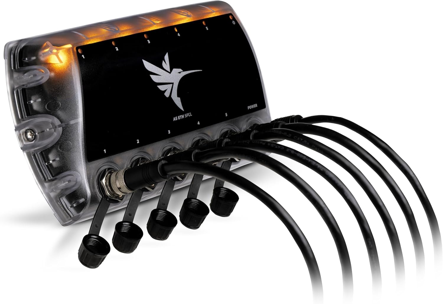 Build a smarter boat network. Connect up to five compatible Humminbird® fish finders and Ethernet-capable devices to share sonar, waypoints, and control across your system. An amber power light confirms power, while amber/green port lights show connection and traffic (Solid = connected; Flashing = data transfer; Off = no connection). Amber port devices: HELIX® G4N/G3N, AS ETH NMEA2K, Minn Kota® trolling motor, Humminbird CHIRP Radar. Green port devices: APEX™ or SOLIX®, MEGA Live Imaging™, MEGA Live Imaging TargetLock™, AS ETH 5PXG, AS ETH 5PGL. Compatible with all APEX, all SOLIX, HELIX G4N, and HELIX G3N models.