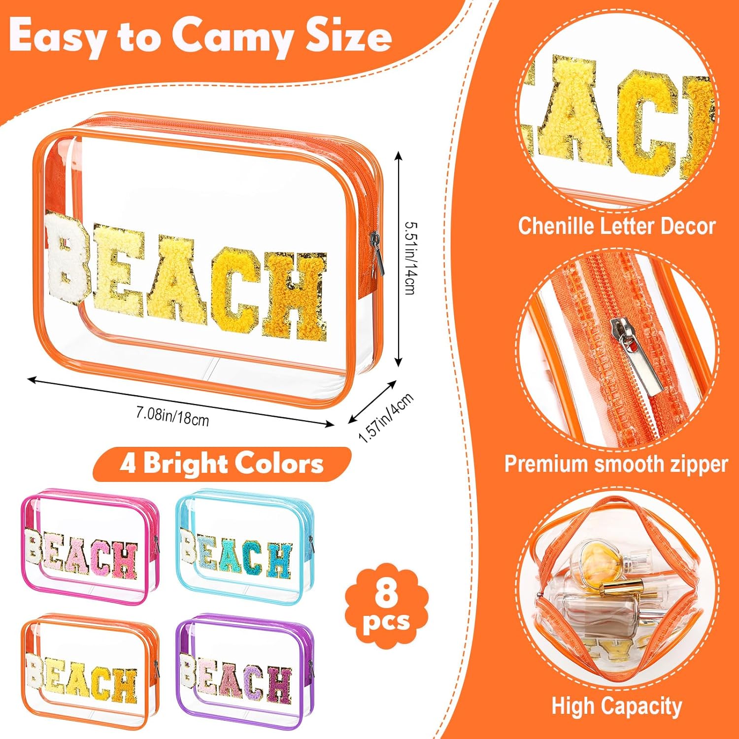 Features: Versatile and multifunctional: These compact beach clear toiletry bag bulk are your ideal companions for both daily commuting, traveling and outdoor activities, the portable size makes them convenient to organize and carry a variety of personal items, making them in an orderly manner and bringing your life more convenience. Useful gift choice: With 8 bags in one set, split them among friends or stock up for every occasion! Packaged in recyclable boxes, they're ideal for birthdays, bridesmaid gifts, or self-care treats. Specifications: Material: PVC Color: Bag: clear, blue, purple, rose pink, orange Size: about 7.08 x 5.51 x 1.57 inches/ 18 x 14 x 4 cm Package includes: 8 x Clear makeup bags Notes: Manual measurement, please allow slight errors on size. The color may exist a slight difference due to different screen displays