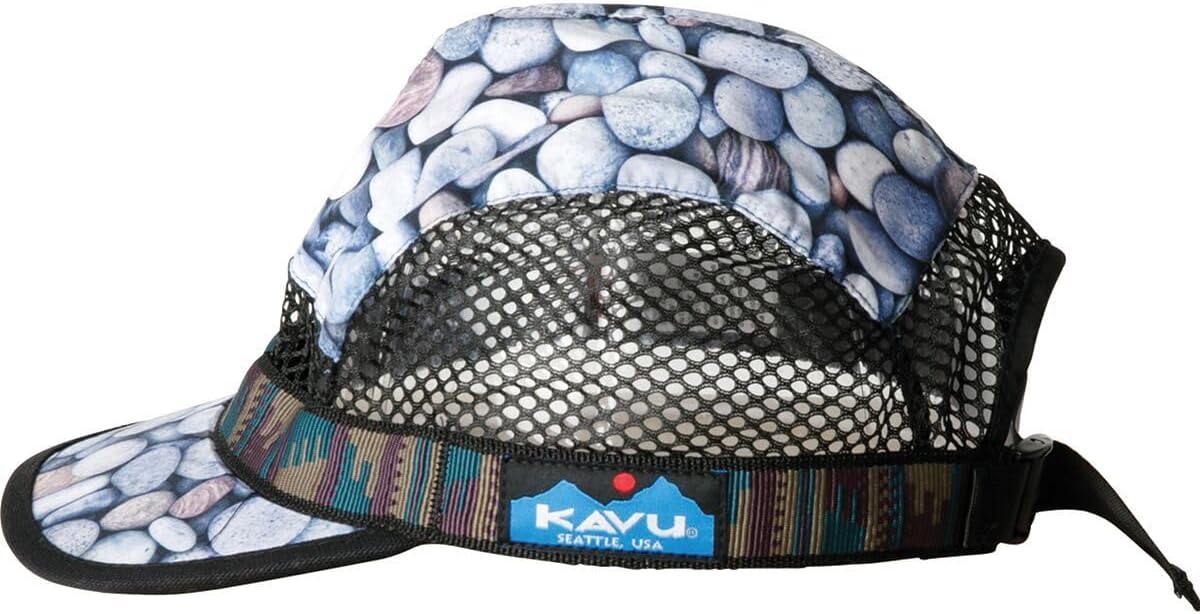 5 panel cap, slight curved bill, ventilation mesh panels, black underbill, patterned nylon tubular webbing with KAVU adjustment