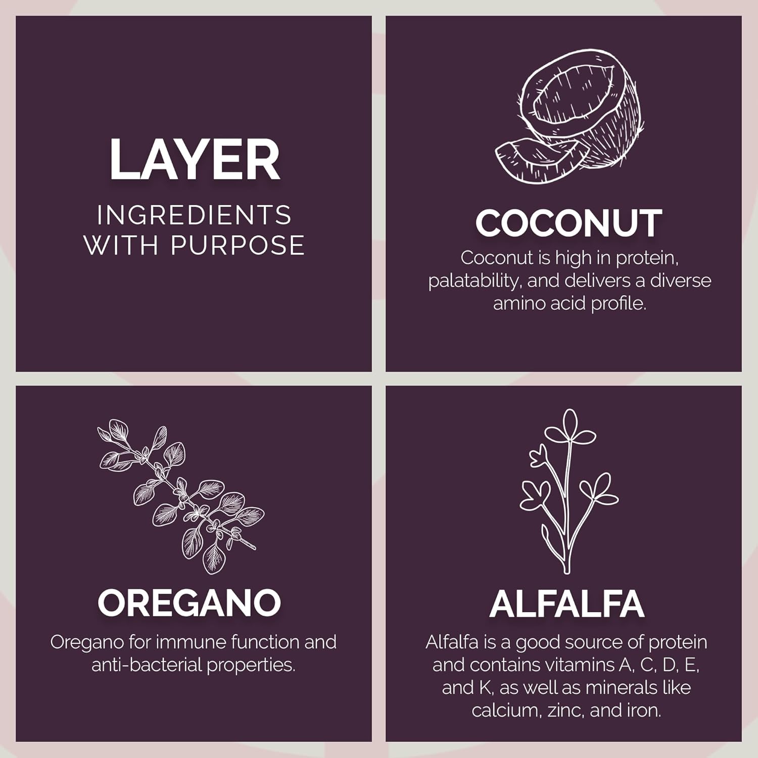 | Special Ingredients | Coconut, Oregano, Alfalfa |
