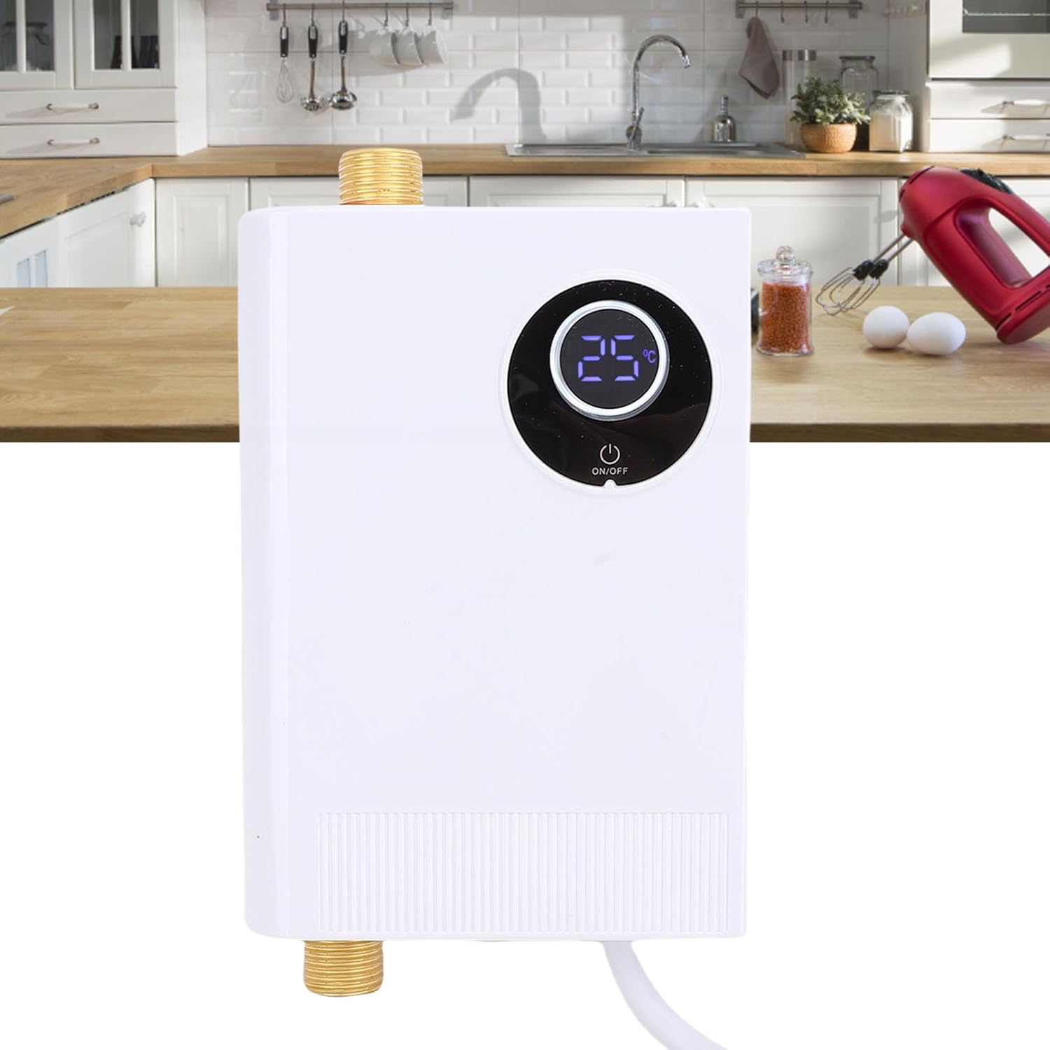 [Energy Efficient Performance] This variable frequency constant temperature water heater delivers hot water while minimizing energy consumption. the precise temperature control and compact design make it an eco-friendly solution for your kitchen, bathroom, or mobile living space needs. [Versatile Installation Options] Designed for convenience, this compact tankless water heater fits perfectly in kitchens, apartments, bathrooms, and rvs. its space-saving design allows for easy under-sink installation while vertical mounting ensures optimal performance and prevents heating component issues in any living space. [Durable Brass Construction] The inlet and outlet ports of this mini water heater are crafted from brass, ensuring exceptional sturdiness and rust resistance. this robust design guarantees long-lasting performance even in harsh environmental conditions, making it a reliable choice for years of consistent hot water supply. [Advanced Safety Features] Featuring an ipx4 rating and thin design, this intelligent electric water heater operates safely in humid environments. the built-in protection system and automatic performance checks provide peace of mind while delivering consistent hot water whenever you need it. [User-friendly Digital Interface] Equipped with a bright lcd digital screen and intuitive touch controls, this water heater offers effortless operation. the intelligent self-checking function continuously monitors working status and performance, ensuring safe and efficient operation at all times. Spec: Item Type: Tankless Water Heater Product Color: White Material: Stainless Steel, Brass Control Method: Touch Screen Water Proof Level: IPX4 Package List: 1 x Water Heater 2 x Screws 2 x Expansion Pipes 1 x User Manual How To Use: Take out the product for direct use