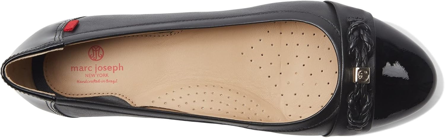 Accentuate your chic style in the MARC JOSEPH NEW YORK Park Ave Flat. Designed in NYC and crafted by skilled artisans in Brazil. Genuine leather braid bow detailing. Genuine Calf leather upper. Fully lined in Genuine Napa Calf leather. Gel heel insert, densely padded footbed & blunt arch support for optimized comfort. Durable and flexible injected rubber sole for walking traction & superior comfort. Signature red tag. Slip-on style. Round toe silhouette. Low block heel. 1/2 inch heel. Made in Brazil.