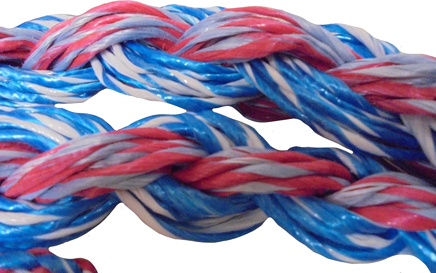 Multi Colored Saddle Bronc Rein Slim Neck Blue/White Poly mix with Red/Grey Poly mix Great feeling Bronc Rein Normal size 6 1/2 - 7 feet in length Our Reins are hand braided in the USA at time of order for all levels of Rodeo