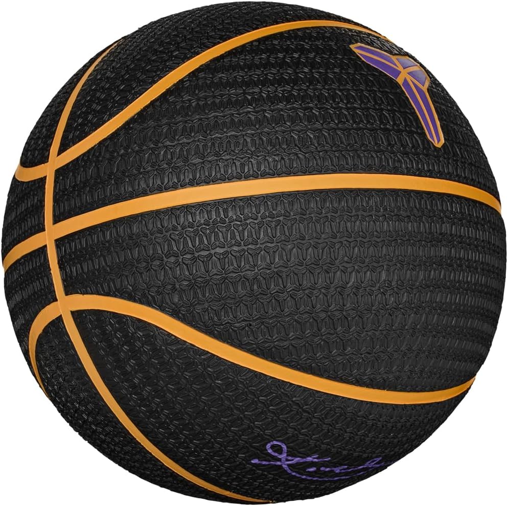 Kobe Bryant's signature logo on the entire surface of the ball as a grip pattern. Durable rubber ball ideal for outdoor court use Recommended Use: Outdoor Material: 100% Rubber Country of Origin: Thailand. Size: No. 7 Ball Color: Black/University Gold/Coat Purple/University Gold