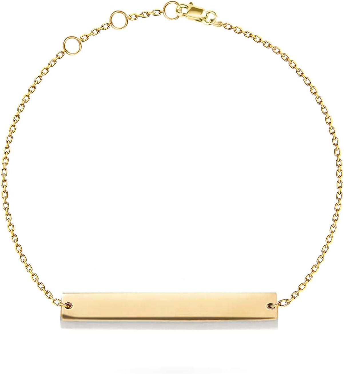 Elevate your style with our exquisite 14K Gold Name Bar Bracelet. This stunning piece can be personalized with engraving options - your name, special date, a meaningful number, or even coordinates and longitudes. It's the perfect gift for her, whether it's for Christmas, her birthday, or Mother's Day. Crafted with attention to detail, this name bracelet adds a touch of sophistication to any attire. Choose between a 0.85mm or sturdy 1.00mm cable chain, and select your preferred clasp - spring or lobster.