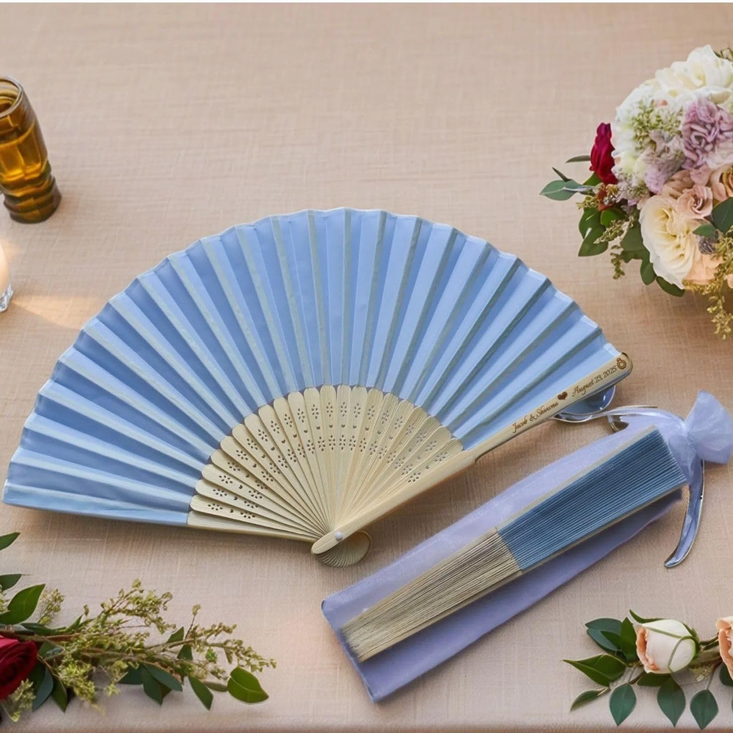 Features:* Ideal for keeping cool, folding into small spaces, easy to carry* Suitable for weddings, residences, offices, stages, parties and festivals, bridal shower favor, baby shower,Christmas Gift* With a pleasant faint aroma, these fans will bring you a fresh and elegant feeling*Customizable with laser engraving: Add a personal touch to your fan by having a special message, name, or design engraved with precision using our advanced laser technology.Product description:The Silk Fan-Sky Blue design adds a touch of elegance, and the best part is that each fans can be customized with laser engraving. Simply click on "Customize Now" to start creating your very own unique fan with a special message, name, or design. Material: Silk and Bamboo * Color: natural bamboo primary color and sky blue * Specifications: 8" x 1" x 1" inches (Folding) - ( 21 x 2.5 x 2.5 cm), 15" x 8" inches (unfolded) - ( 38 x 21 cm) Package Contents: Qty * Silk fans These fans are not only practical, but they also serve as a beautiful decorative piece, perfect for weddings, graduations, parties, and festivals.