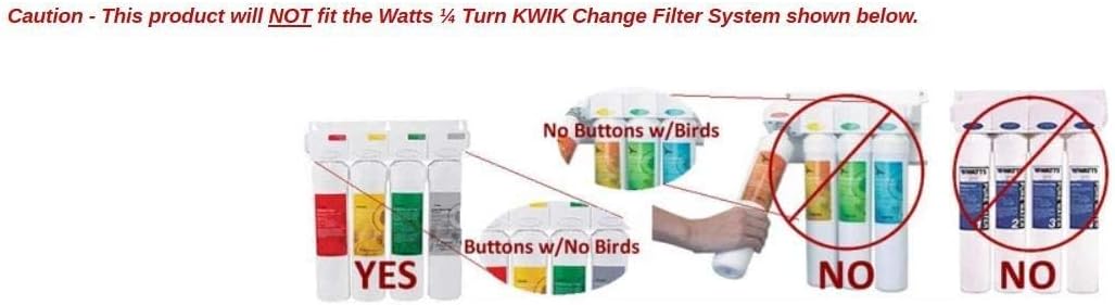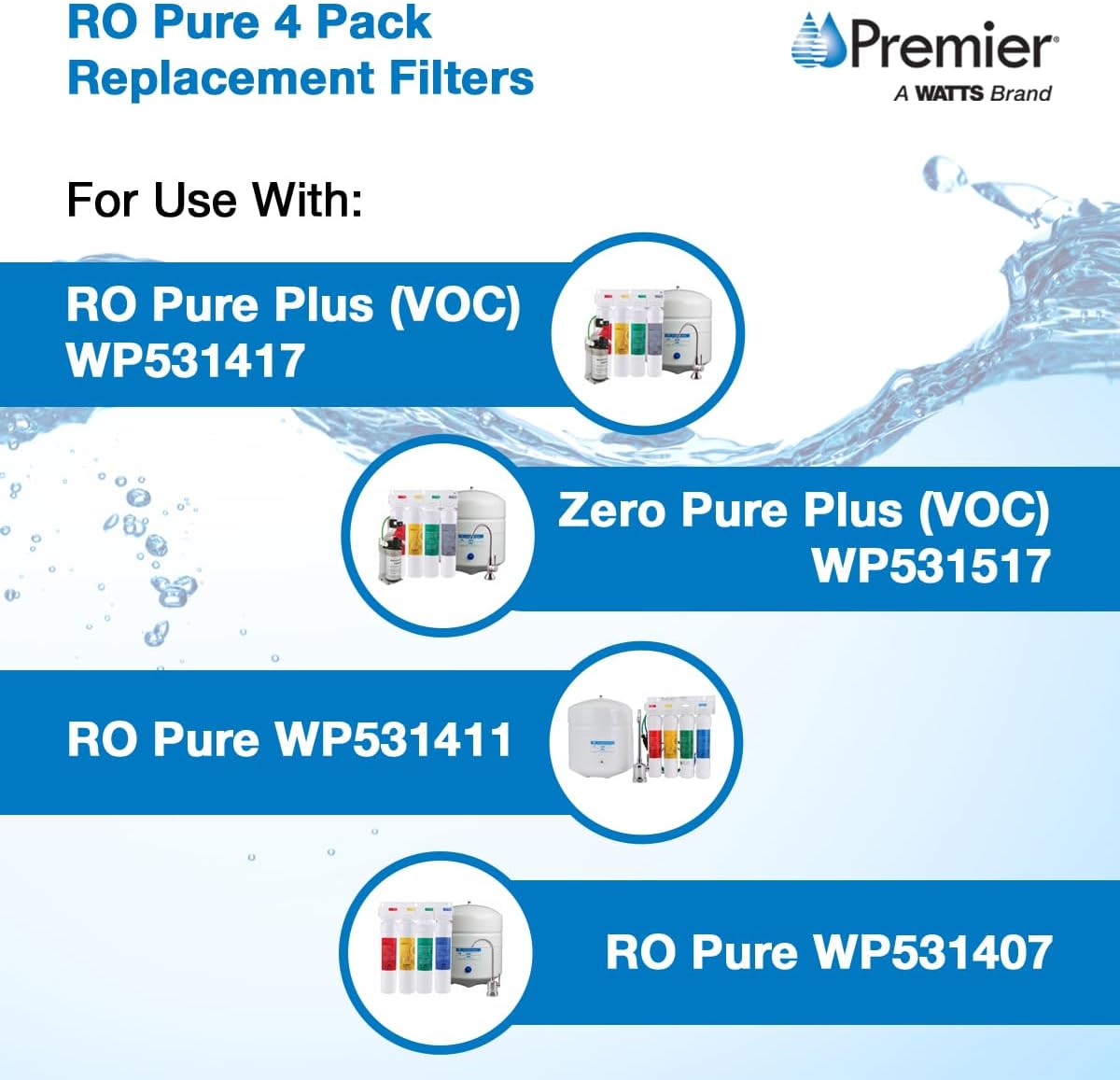 Product Description Say goodbye to unpleasant tastes and odors and say hello to fresh water with the Watts Premier RO Pure 4-Pack Filter Kit, a complete set of water filters for your under sink RO Pure (WP531411, WP531407) or Zero/Pure Plus (WP531517, WP531417). The included 3 filters and membrane are tailored for specific filtration purposes, collectively ensuring crystal clear, great-tasting drinking water every time.This comprehensive kit includes one 5-Micron Sediment Filter (WP105311) for reducing dirt, silt, and rust that affects the taste and appearance of your water; one 5-Micron Activated Carbon Pre-Filter (WP105351) and one 5-Micron Activated Carbon Post-Filter (WP105341) for conditioning the water and reducing chlorine taste and odors; one 50 GDP Semi-Permeable Membrane (WP105331) for reducing TDS and contaminants like arsenic, lead, nitrates, percolate, and copper, as well as cysts, including Giardia and Cryptosporidium.Our filters are crafted from only the highest quality materials for durability and maximum filtration. Filter life may vary based upon local water conditions or use patterns, but we recommend replacing sediment and carbon pre-filters every 6 months, the carbon post-filter once a year, and the membrane every 2 to 5 years.Refreshing hydration isn't the only thing that makes these top-performing 11-inch filters stand out; they also feature a user-friendly design, with each filter conveniently denoted by a different color for easy identification: red for sediment, yellow for pre-filter, blue for post-filter, and green for membrane. Furthermore, they are equipped with a push button release that allows for hassle-free replacement without shutting off the water source. Easily change out filters with a quick push of a button - no special tools required!Please note this kit will NOT fit the Watts 1/4 Turn Kwik-Change RO System. From the Manufacturer The Watts Premier RO Pure Replacement Water Filter Kit provides a complete replacement supply of filters for your RO Pure RO-4 reverse osmosis system. This kit includes one of the following replacement filters: • 1 of F105311- 11" Sediment Prefilter (Red) • 1 of F105351- 11" Carbon Prefilter (Orange) • 1 of F105331- 11" 50 gpd Membrane (Green) • 1 of F105341- 11" Carbon Postfilter (Blue) PLEASE READ: Watts Premier RO-Pure Filters change out at the push of a button. These filter will not fit Watts Kwik Change RO units. which requires a 1/4" Turn.