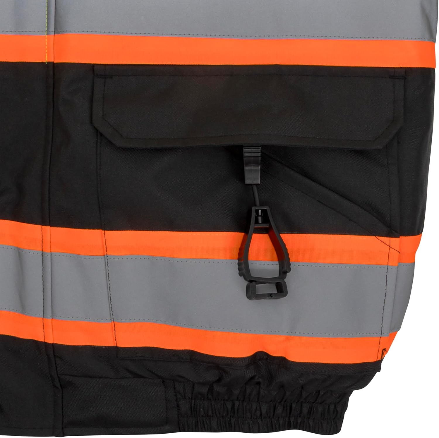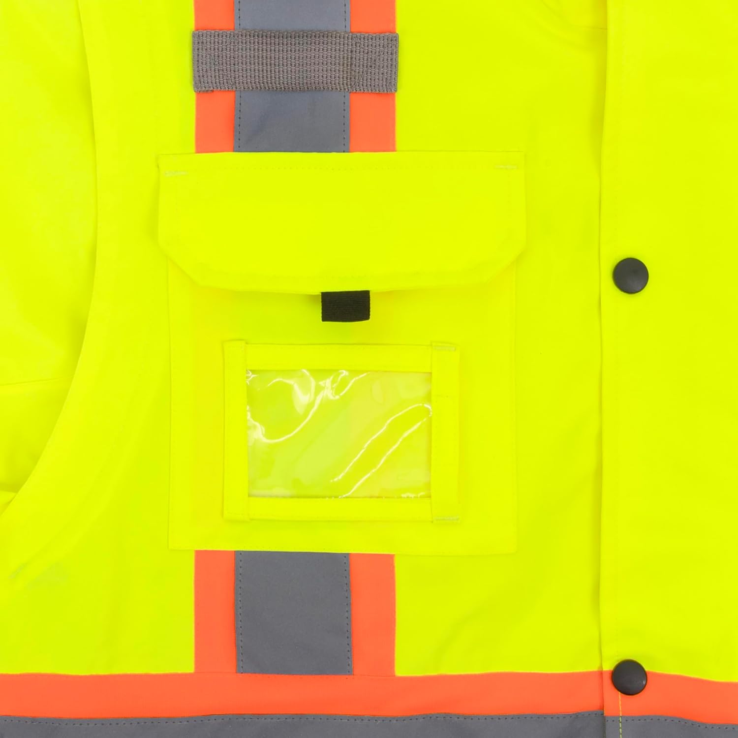The Radians SJ511B Quilted Hooded Bomber Jacket delivers warmth, durability, and adaptable safety for all-weather jobsite conditions. Its insulated polyurethane coated polyester shell provides reliable weatherproof protection, while a front zipper closure with storm flap and removable hood blocks wind and rain. Black color-blocking adds durability and helps conceal dirt for a cleaner appearance. Designed with 12 functional pockets—including a tablet pocket, hand-warmer pockets, and a glove clip—this jacket keeps gear secure and accessible. A clear badge holder and dual mic tabs support identification and hands-free communication. For maximum versatility, removable sleeves convert the jacket into a vest, delivering ANSI/ISEA 107-2020 Class 3 compliance when worn as a jacket and Class 2 compliance when worn as a vest. Built for flexibility and function, the SJ511B is the ideal choice for workers who demand comfort, storage, and visibility on the job.