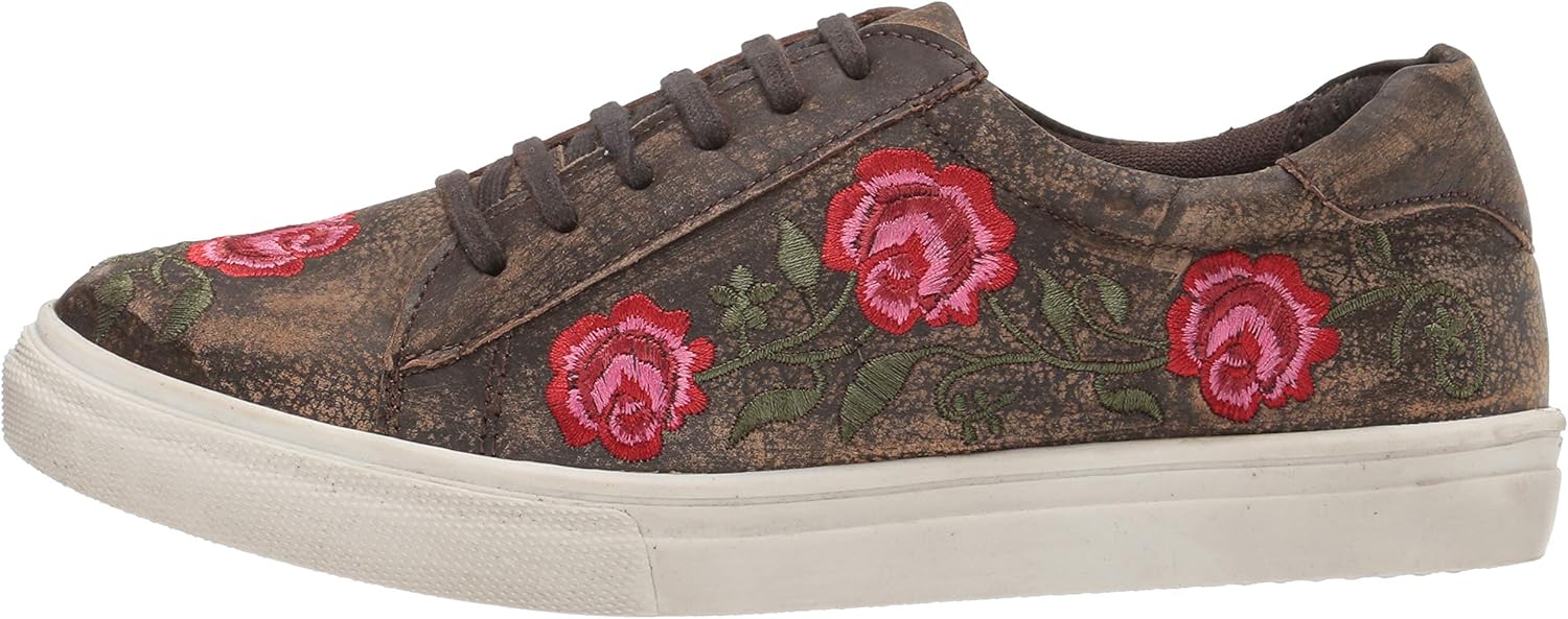 The madeline by Roper is a fun and comfortable shoe that goes great with many outfits. It has a brown sanded leather with rose embroidery on a new contemporary flat rubber sole. There is a moisture wicking lining added along side a cushioned pig leather lining insole for extra support.