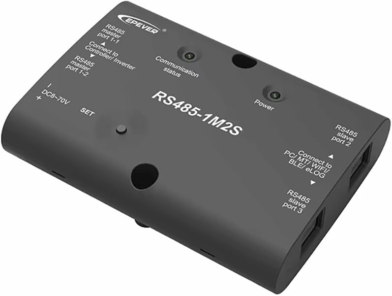 Overview:The RS485-1M2S extension module is an optional accessory that can extend the RS485 communication port of solar controller/inverter. Based on the standard Modbus protocol, the user can monitor the operating status and set parameters through the monitoring devices connected to the RS485-1M2S extension module. The RS485-1M2S main port 1-1 and 1-2 are connected in parallel, which can connect 1 or 2 slave devices, such as a solar controller/inverter. And the RS485-1M2S slave port 2 and 3 are independent, which can connect 1 or 2 moni toring devices at the same time, such as remote meter/WIFI module/Bluetooth module/PC software, etc.Features:Extend the RS485 communication port of the solar controller/inverterData interaction between the solar controller/inverter and monitoring devicesStandard Modbus communication protocolOne key to set the communication baud rateLED screenTechnical Specifications: Model:RS485-1M2SCompatible products: Solar controller/inverterPower supply: 5VDC(Power supply by the communication port of solar controller/inverter)Auxiliary power supply:8~70VDC(Auxiliary power supply by the battery)Power consumption: 0.3WCommunication baud rate:115200 (Default) 9600Working environment temperature: -30℃~50℃Enclosure: IP30Dimension:121* 88* 27.5mmMounting dimension:69mmMounting hole size: Φ4.8Net Weight: 121.8g