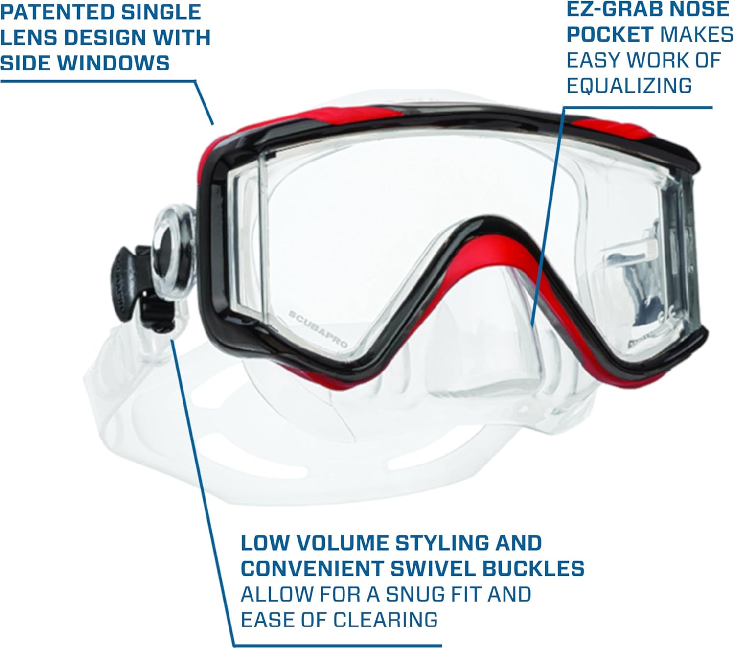 Scubapro's Crystal VU Mask with Purge has a patented tempered single glass lens design, with patented no-seam side windows for increased field of view. The lenses are no-tint glass for greater visual clarity and safety in diving. With its double feathered edge sealing crystal clear silicone rubber skirt for increased comfort, wide split style mask strap and streamline shape combined for a snug fit all makes this one great mask for any diver. This model of Scubapro VU-Plus Mask has a one-way purge valve for hands free clearing and like the non-purge version is equipped with push button swivel buckles for easy adjustment and on/off action. Mask comes with an easy to reach one hand nose pocket for ear equalization that can be utilized even when wearing thick gloves. The Scubapro Crystal VU-Plus Mask provides an exceptional panoramic view of the underwater world. Although it is a 3-window mask, the Vu-Plus provides a low internal volume that is easy to clear. Mask has an over-molded frame for strength and durability. The lenses of the mask are made from an ultra-clear glass. Standard glass has a green tint. The green tint you see is the result of iron impurities left over in lower quality "float" or window type glass. That green tint distorts true colors and blocks out some of the light that reaches the eye. Ultra clear is a new and exciting optical quality tempered glass with exceptional clarity and high light transmission, with no color distortion. The exceptionally high light transmittance and lack of distortion in the ultra-clear lens maximizes the light available for improved visual acuity, especially underwater in low light conditions, better vision, truer colors are what you get with Scubapro's Ultra-Clear lenses. The Scubapro Crystal VU-Plus Mask is available in multiple color choices and comes with a protective mask box.