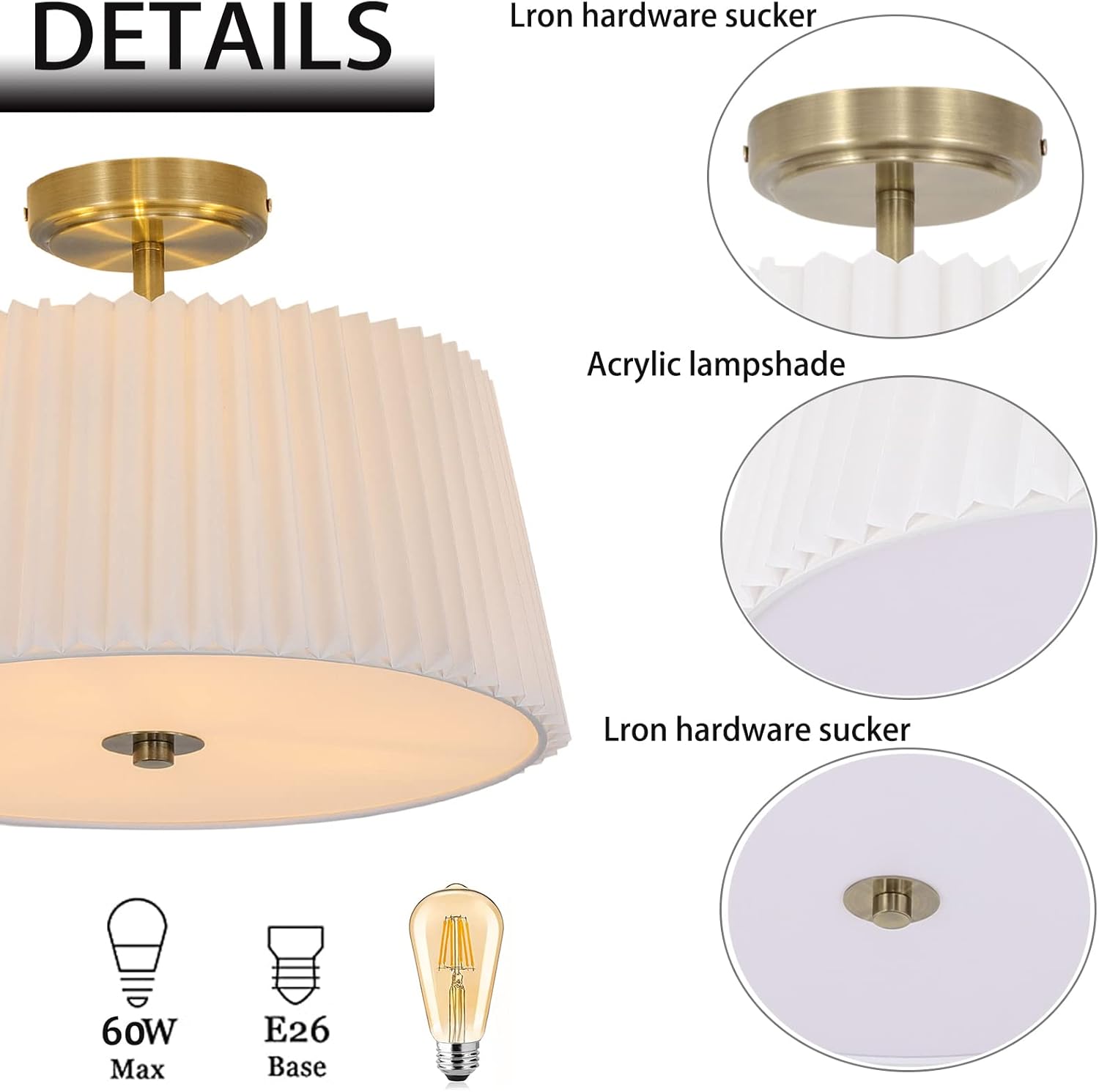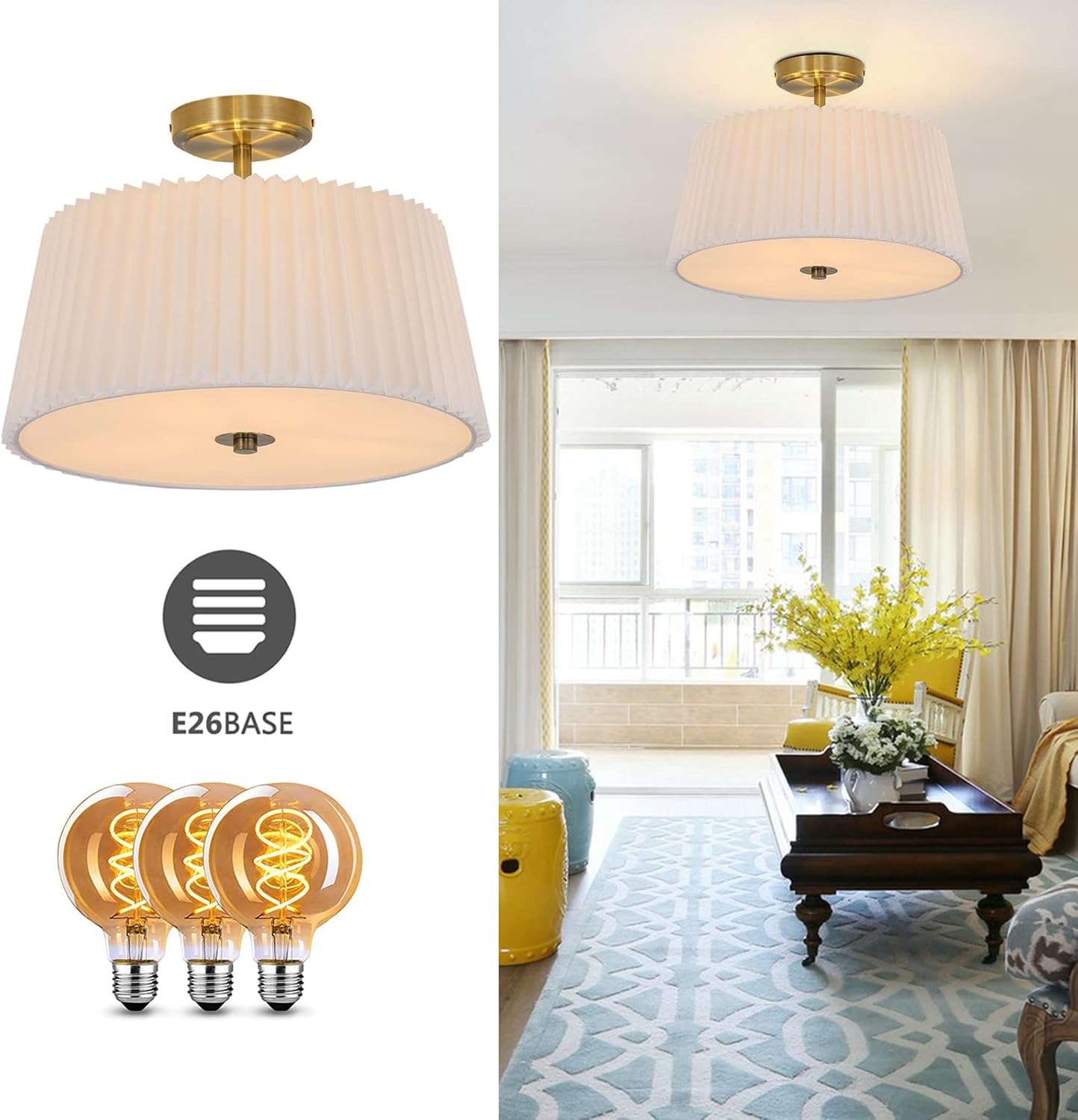 SpecificationMaterial: Iron, FabricModel: JK4050Color: White Shape: Fan-shapedStyle: Simple and ModernLamp Form: Fabric Ceiling LightLight Source Type: Any Bulb With E26 Bulb Holder Bulb Maximum Wattage: 60WNumber of Light Sources: 3 (Not Included)Surface Finish: ElectroplatingInstallation Type: HangingVoltage: 85-240V 50/60HzMaximum Slanting Top Angle: 90°Illuminated Area: 30㎡/323sq. ftAdjust Brightness: Compatible with Dimming Lamp and Dimmer SwitchAssembly Required: YesGross Weight: 2.8kg/ 6.17 lbs Net Weight: 2kg/ 4.41 lbsProduct Size(φ&H): 40*28cm/ 16*11 inCeiling Tray Diameter: 12cm/4.72inPackage Size: 46*46*25cm/ 18.11*18.11*9.84inPackage Included1 * Fabric Semi Flush MountNotes1.This product does not include the bulbs, please purchase them yourself.2.This product is not waterproof, please install it in a dry environment.3.Please disconnect the power and wipe with a soft, dry cloth before cleaning the shade or fixture. Please avoid using chemicals and household cleaners as they may damage the finish.4.Products with electrical plugs are designed for use in the US. Please check compatibility before purchasing.5.Please allow the slight color difference caused by the shooting light and the 1-3 cm error due to manual measurement, and make sure you do not mind before ordering.