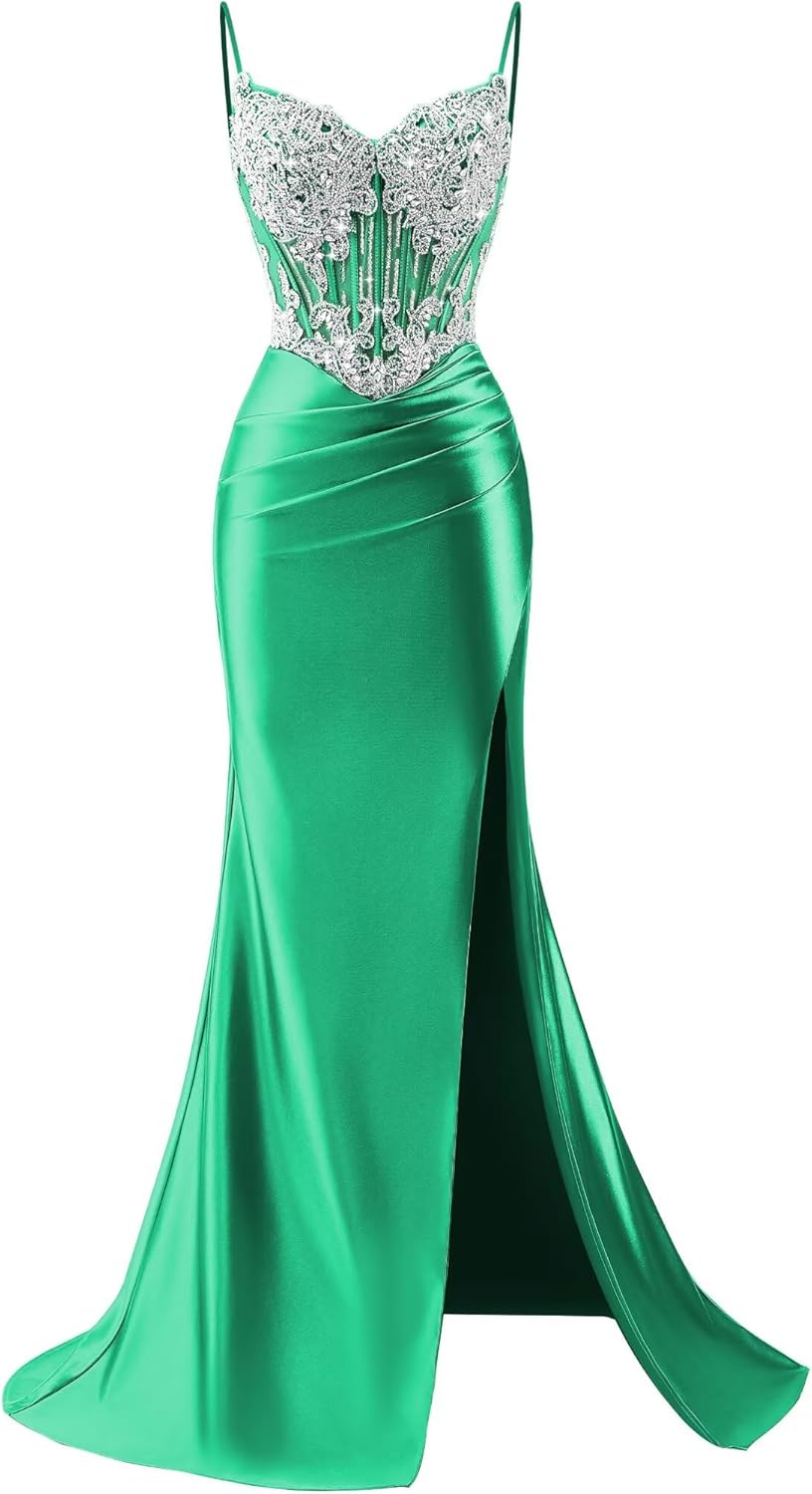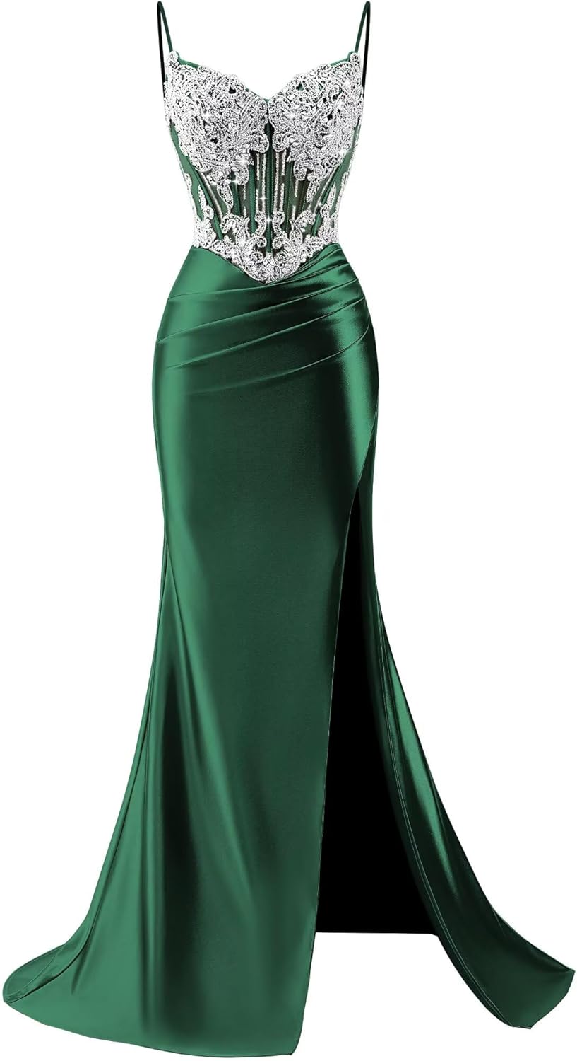 Silhouette & Fit: The gown features a strapless sweetheart neckline with delicate spaghetti straps. The structured bodice is sculpted to contour the body, with a cinched waist that flows into a gracefully draped satin skirt. The skirt flares softly from the hips and sweeps the floor, creating a slimming and elegant silhouette. Design Details: The bodice is adorned with intricate silver beadwork and crystal embroidery, arranged in delicate floral or geometric motifs. Lace accents along the edges add texture and opulent dimension. The skirt, made of lustrous satin, features a subtle side slit for fluid movement and a touch of modern allure. Occasions: Ideal for proms, galas, weddings, pageants, and other formal or semi-formal events where polished elegance is desired.