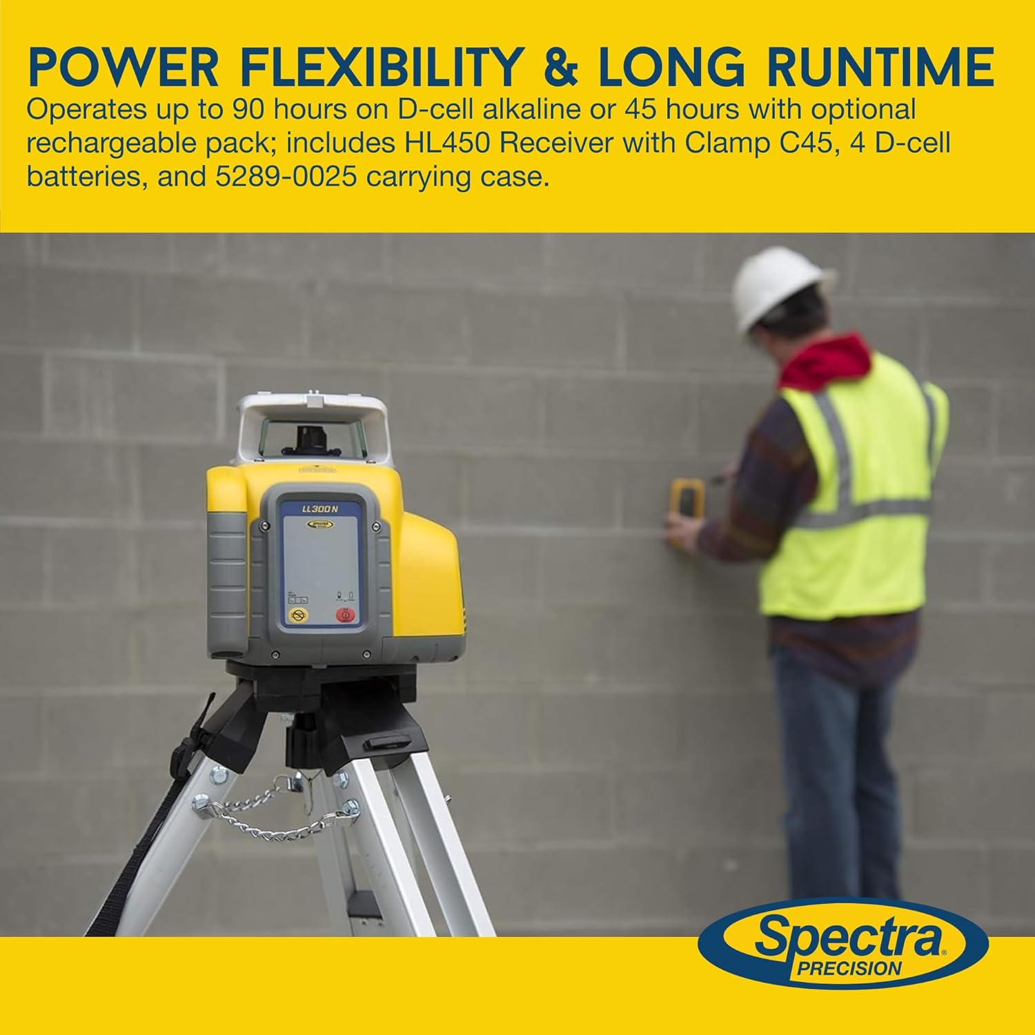 Product Description The Spectra Precision LL300N Laser Level features a rugged design with a metal sunshade that provides superior drop and weather protection (IP66). Its fully automatic self-leveling capability provides a fast, accurate setup on any construction site, in any type of weather. Rechargeable NiMH battery pack or alkaline batteries keeps the tool working with no downtime due to power loss. Built to withstand severe drops of up to 3 ft (1 m) directly onto concrete, or up to 5 ft (1.5 m) when pushed over on a tripod. Comes standard with HL450 digital readout receiver and other configurations are available. One person elevation control with 1,650 ft (500 m) diameter range increases productivity. What's included in the box: LL300N Laser Level, HL450 Receiver with Clamp, 4x D-Cell Alkaline Batteries, Multi-language Operating Manual, and Hard Shell Carrying Case. Amazon.com The Spectra Precision Laser LL300N is your medium-range, high-accuracy solution. Ideal for basic slope work such as driveways and ramps, checking or leveling elevations, concrete forms, footings and foundations for small- and medium-sized jobs, and for excavations, digging footings and septic tanks. P.when('A').execute(function(A) { A.on('a:expander:toggle_description:toggle:collapse', function(data) { window.scroll(0, data.expander.$expander[0].offsetTop-100); }); }); From the Manufacturer Rugged enough for tough job-site use, the Spectra Precision Laser LL300N Level delivers automatic self-leveling performance to help you get work done quickly, accurately, and efficiently. Bundled with the HL450 Receiver, the LL300N is a perfect choice for tackling elevation-control applications and handling concrete and other general construction jobs. See more
