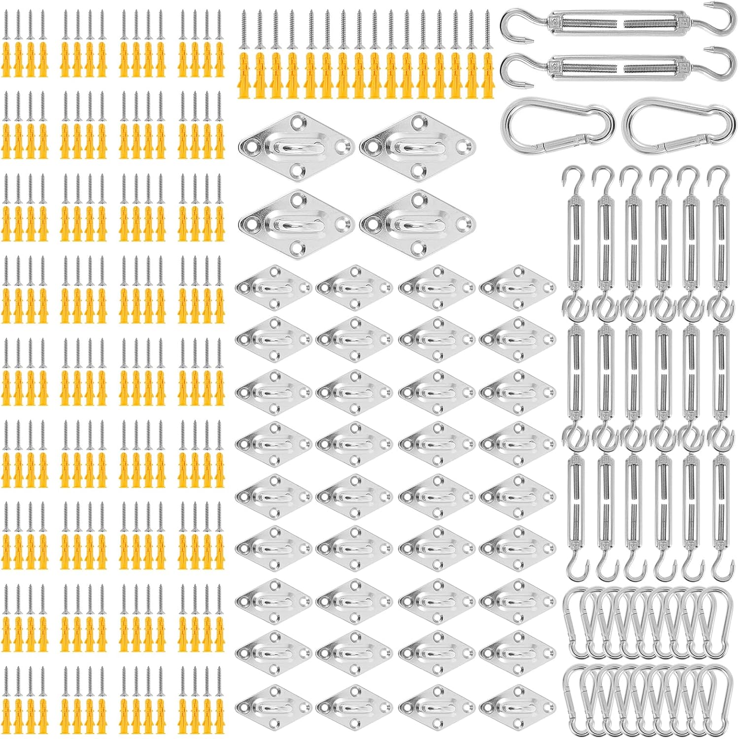 Parts List:80 x screws (80 sets of screws)20 x hook20 x Hook40 x diamond buckle Product Specification:Description:This kit is made of high quality 304 stainless steel. It is suitable for everyday outdoor garden and yard use. Its wire rope has a strong load carrying capacity and is ideal for tightening or loosening the sunshade sail. It can be securely fastened to the wall. Key Feature:Strong Carrying Capacity: Its steel wire rope has a strong carrying capacity. The closed turnbuckle in the suit is then adjustable to help generate tension and is ideal for tightening or loosening the sunshade sail.Expanded Plastic: This set contains additional plastic expansion to fit sharp screws for a firmer fix rather than a direct fix to the wall. Specification:Product Name: Sun Shade Sail Hardware KitMaterial: Stainless steelSize: Hook size (length 12 cm) Note:1. There may be slight color differences between the product picture and the actual item. We will do our best to display the color as accurately as possible.2. Please allow slight dimensional discrepancies due to manual measurement.