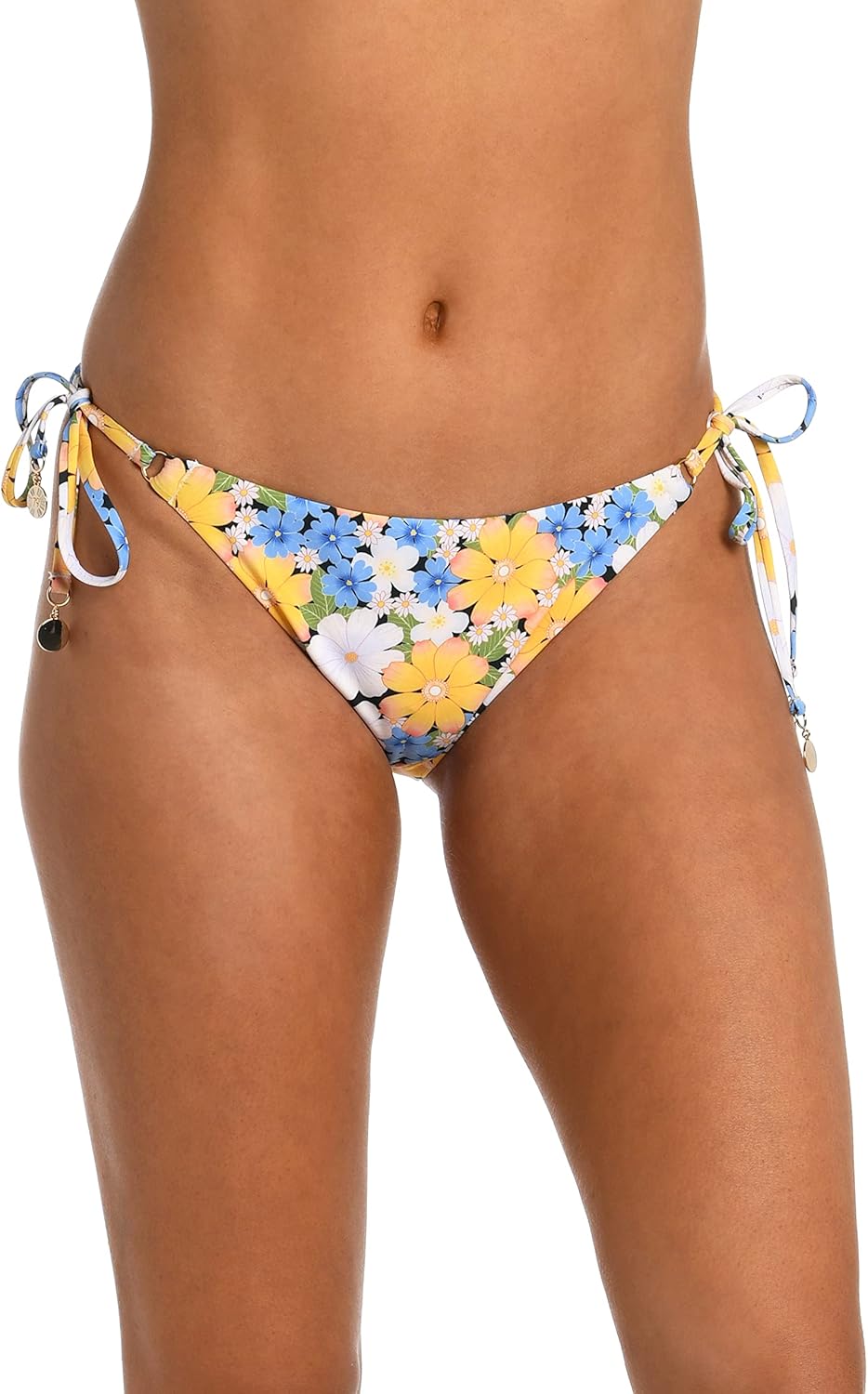 Rendered in soothing shades of sky blue and seafoam green, these bikini bottoms are the definition of tranquility – and an open invitation to relax and unwind. String side ties tipped with gold trim flatter the hips while cheeky coverage in back highlights your derrière.