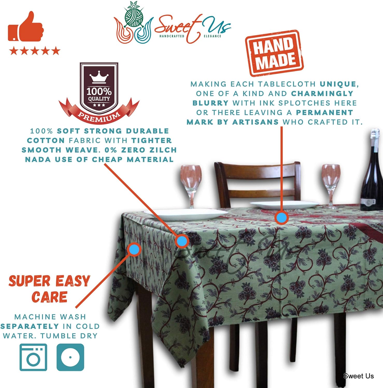 Enhance your kitchen and dining decor with this beautifully handcrafted tablecloth. A beautiful handmade tablecloth highlighting a spectacular floral design in shades of green and crimson red flaunting fascinating multiple borders. It is perfect to enhance your home decor. Handmade makes it charmingly unique, one of a kind. Safe and incredible for everyday use and for special occasions. This tablecloth is good for picnic, camping, wedding, Birthday party, restaurant, buffet, Easter, Thanksgiving and Christmas day. Premium quality material. It is made of 100% light weight hand-loom cotton fabric which renders the authentic cotton fabric feel. 100% cotton. Super easy care: Machine wash separately in cold water. Tumble dry. Dimensions" About 58 x 90 inches