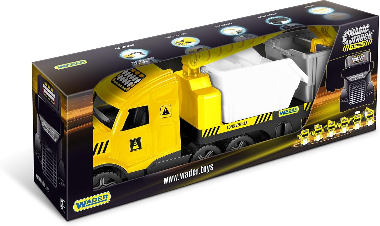 With the Magic Truck vehicles, even the smallest ones can emulate their big idols. The low loader is approx. 79 x 28 x 19.5 cm and comes with two containers, a crane and barriers. The fluorescent headlights glow in the dark. In combination with other toys and vehicles from Wader boys and girls can recreate many imaginative situations. This promotes motor skills, coordination and social behaviour and stimulates the child's imagination. The toy is made of robust plastic, is free from any harmful substances, high-quality workmanship and therefore particularly durable.