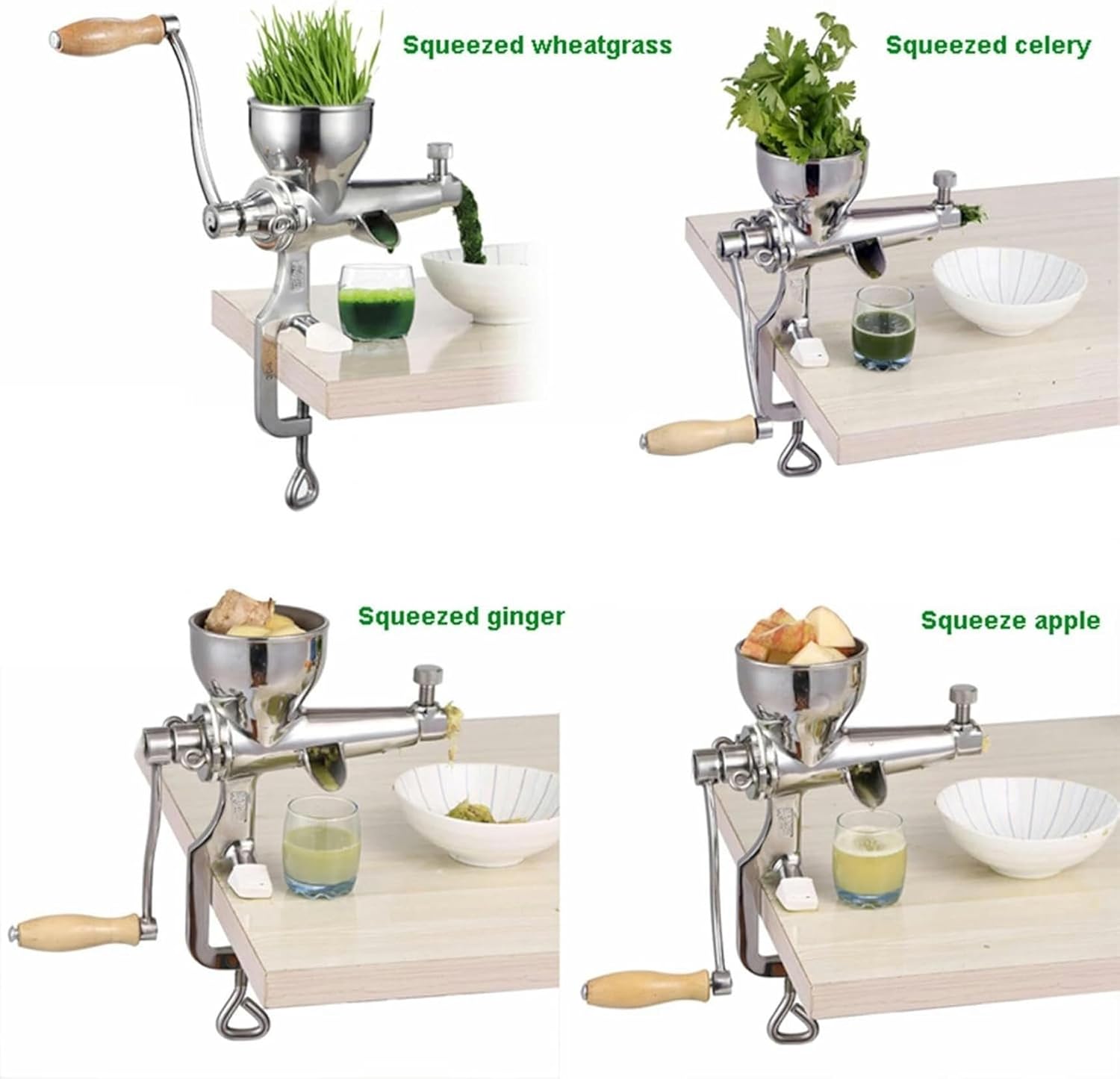 Descriptions: Name: stainless steel manual Juicer Net weight: 2.6kg Inlet size: 9cm Desktop thickness requirements: 5.5 cm or less Main uses: Squeezing wheat grass is convenient and fast, with high juice yield and no damage to nutrition; Squeeze fruits, apples, pears, oranges, etc. by means of manual low-speed spiral auger extrusion to avoid excessive temperature during rabbit rotation, resulting in oxygen content in fruit juice and loss of nutrition (cut 2cm wide strips of apples, pears, etc. for convenient feeding) Squeezed vegetables, cabbage, celery, aloe, pine needles, etc. vegetable juice can be used to make noodles, dough pimples, dumpling skins, etc. it is rich in nutrition and promotes appetite. (carrots contain less juice. This machine is not recommended) Cleaning and maintenance : 1. Rinse with warm water and detergent, and fully dry (please pay special attention to the chassis part of the grinder) 2.Then apply edible oil on the surface of the blade and porous disc to prevent rust (or lubtion) Note: At the beginning of juicing, because there is no slag blockage at the slag outlet, a little juice may drop from the slag outlet. When the handle rotates several times, it's good when there is slag. If the residue outlet is blocked during juicing, turn the handle twice in reverse, and press again after the blockage is clear. If the reverse cannot solve the problem, please unscrew the screws on the back cover, disassemble the machine and clean the blockage.