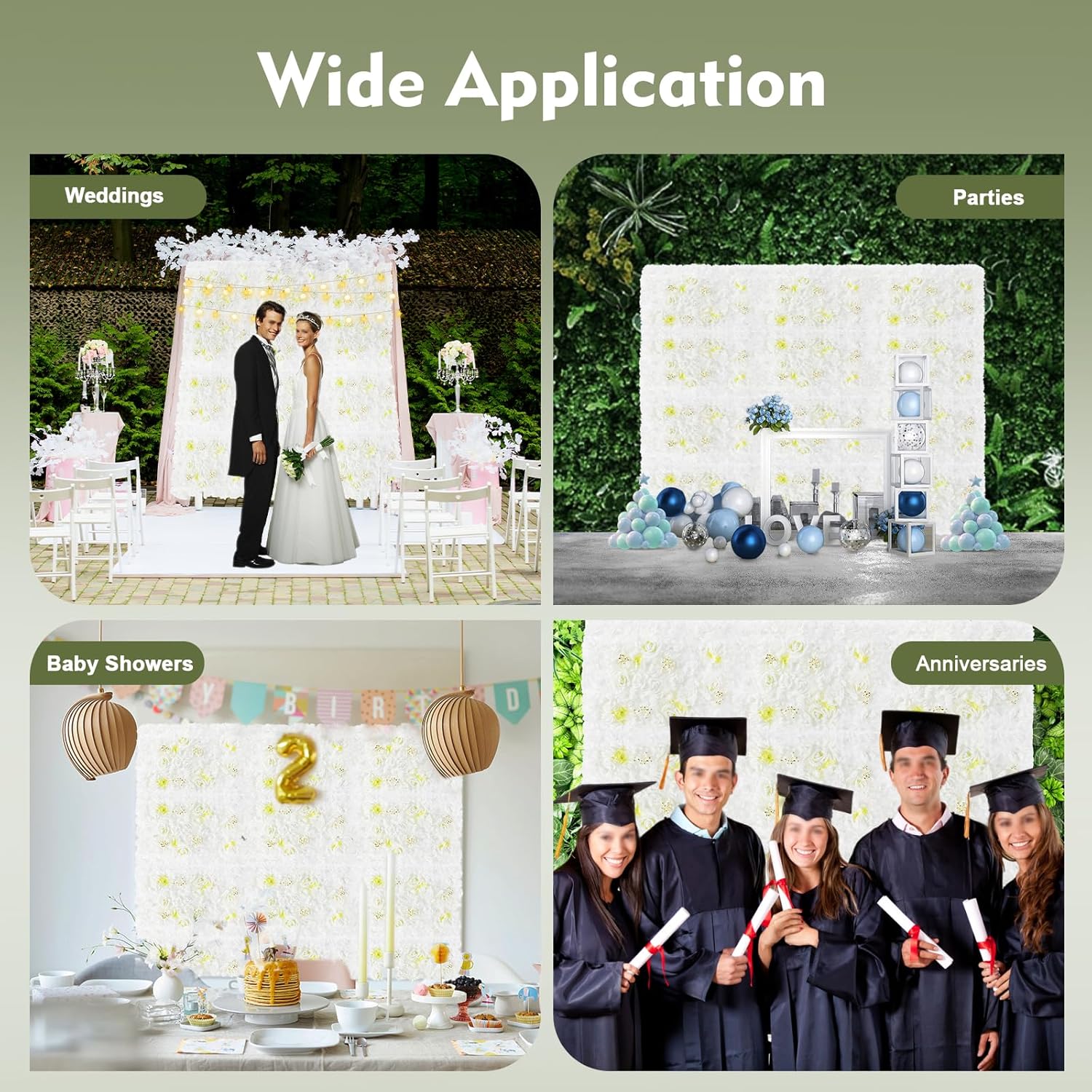 SpecificationsColor: WhiteStyle: Elegant Shape: RectangularNumber of Items: 12Assembly Required: NoMount Type: Wall MountedMaterial: Spun Silk Cloth, PlasticProcess: Cloth Dyeing, ShapingFlower Type: Dahlia, Rose, HydrangeaEach Product Size: 60*40cm/23.62*15.74inPackage Size: 31*41*60cm/12.2*16.14*23.62inGross Weight: 4.35kg/9.59lbsPackage Included12*Flower Wall Panels