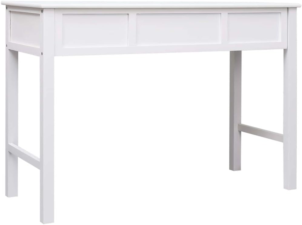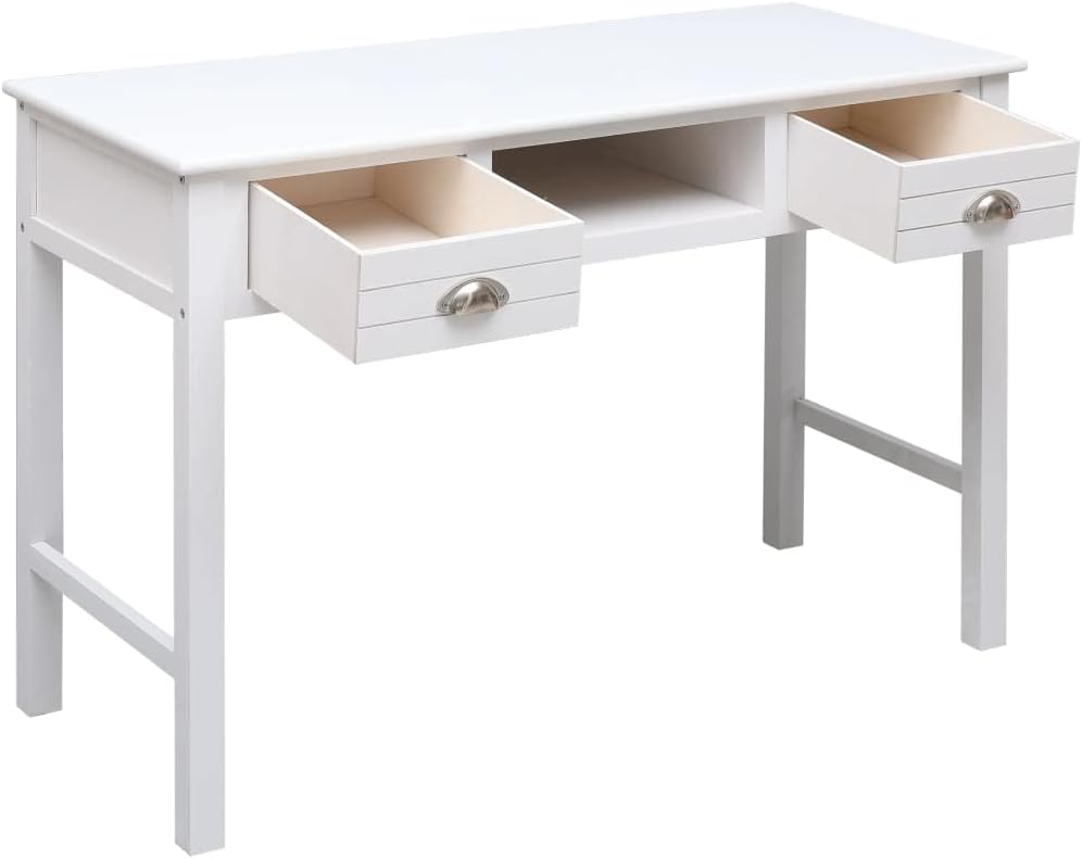 Our classic wooden desk exudes a vintage charm that will make it a distinctive addition to your home or office. It can also be used as a console table, computer table, side table and more.Made of quality paulownia and poplar wood, this desk is sturdy and durable. It features 2 drawers and 1 open compartment in the middle for keeping your files and other home office essentials organized and within easy reach.This desk is easy to assemble.Color: WhiteMaterial: Paulownia wood and poplar woodDimensions: 43.3"x17.7"x29.9"(L x W x H)With 2 drawers and 1 open compartment
