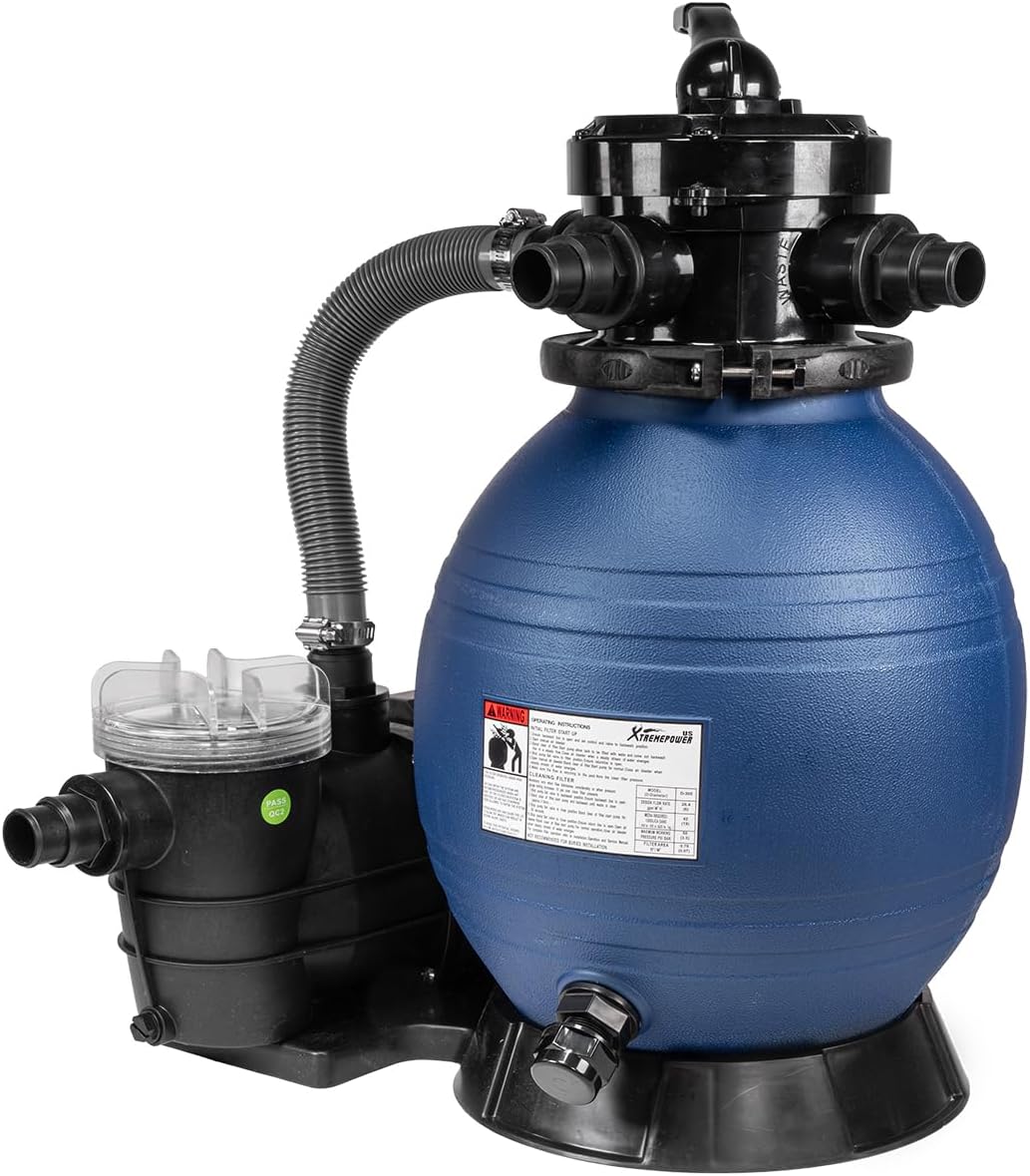 XtremepowerUS 12" Sand Filter Combo for above ground pools. Fully integrated sand filter, pump pressure valve, and stand. 2400 gallons per hour pumping capacity. 43 pounds per hour sand pumping capacity. Just add the filter media (sold separately) and hook up the hoses, plug it in and it starts filtering immediately. Never-rust, blow molded PE tank constructionFeatures:Sizable Capacity - This sand filter pump is housed in a one-piece 12-inch tank with a capacity of 42 pounds of sand that can filter above ground pools up to 10,000 gallonsLow Noise Design - This sand filter pump is designed and optimized for running with low noise, to make your work more comfortable and energy efficientSimple and Easy to Use - 4-way valve, 3-prong plug w/ electric cable, portable, quick start and simple operation, take less than 5 minutes to installDependable Performance - This filter keeps the sand height level to expose water to the maximum sand surface level possible for optimum filtration, consistent performance, and efficient backwashingMulti-Port Filter - Multi port provides for easy use and quick back-washing. These pumps are capacitor start and not for use/sale in California.Specifications:Pool Type: Above GroundFiltration Area: 10,000 GallonsValve Function: Filter, Backwash, Rinse and WastePump Power: 0.75HPVoltage: 115V/60HzFlow Max: 2400GPHInlet/Outlet Fitting: 1-1/4"NPTDrum Capacity: Holds up to 43lbsMax Temperature: 105FWaterproof Level: IPX5Max Suction: 34.4ftOverall Dimension: 17"(W) x 17"(L) x 23-1/2"(H)Assembly Required: YesPackage Contents:Sand FilterPool PumpSystem Tray4 Way ValveHose AdaptersManual